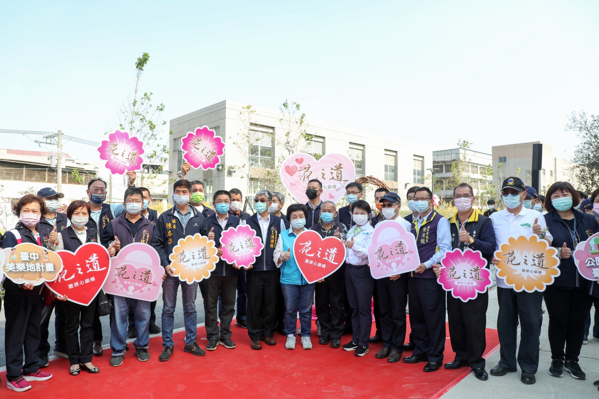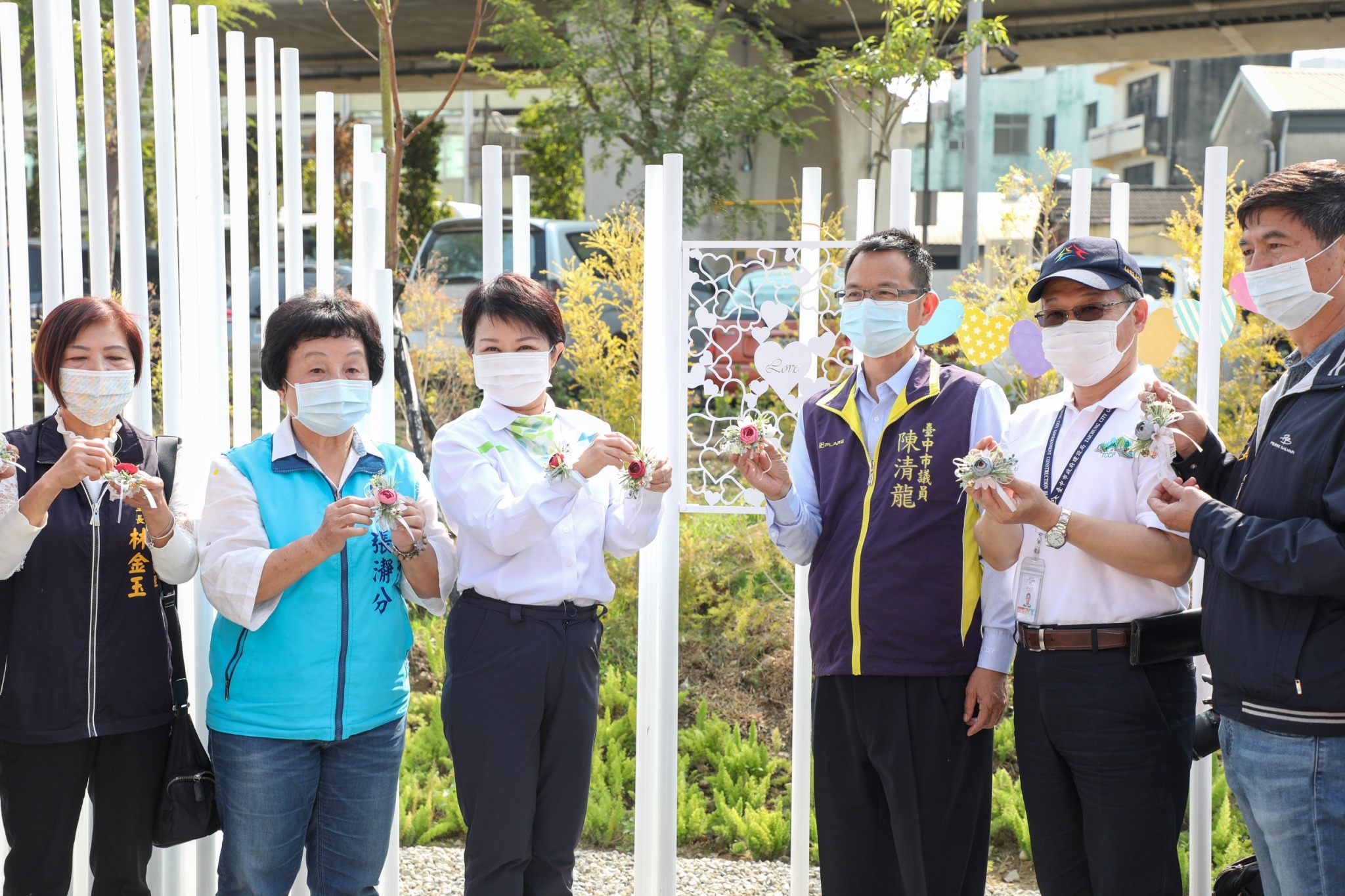 今日「花之道豐原心鎖橋布展計畫完工記者會」,由盧市長、建設局陳局長、消防局長曾進財、市議員張瀞分、陳本添、陳清龍於心鎖橋裝置藝術牆面繫花鈴,象徵豐原心鎖橋花之道正式啟用,市議員王朝坤服務處代表也到場見證。
