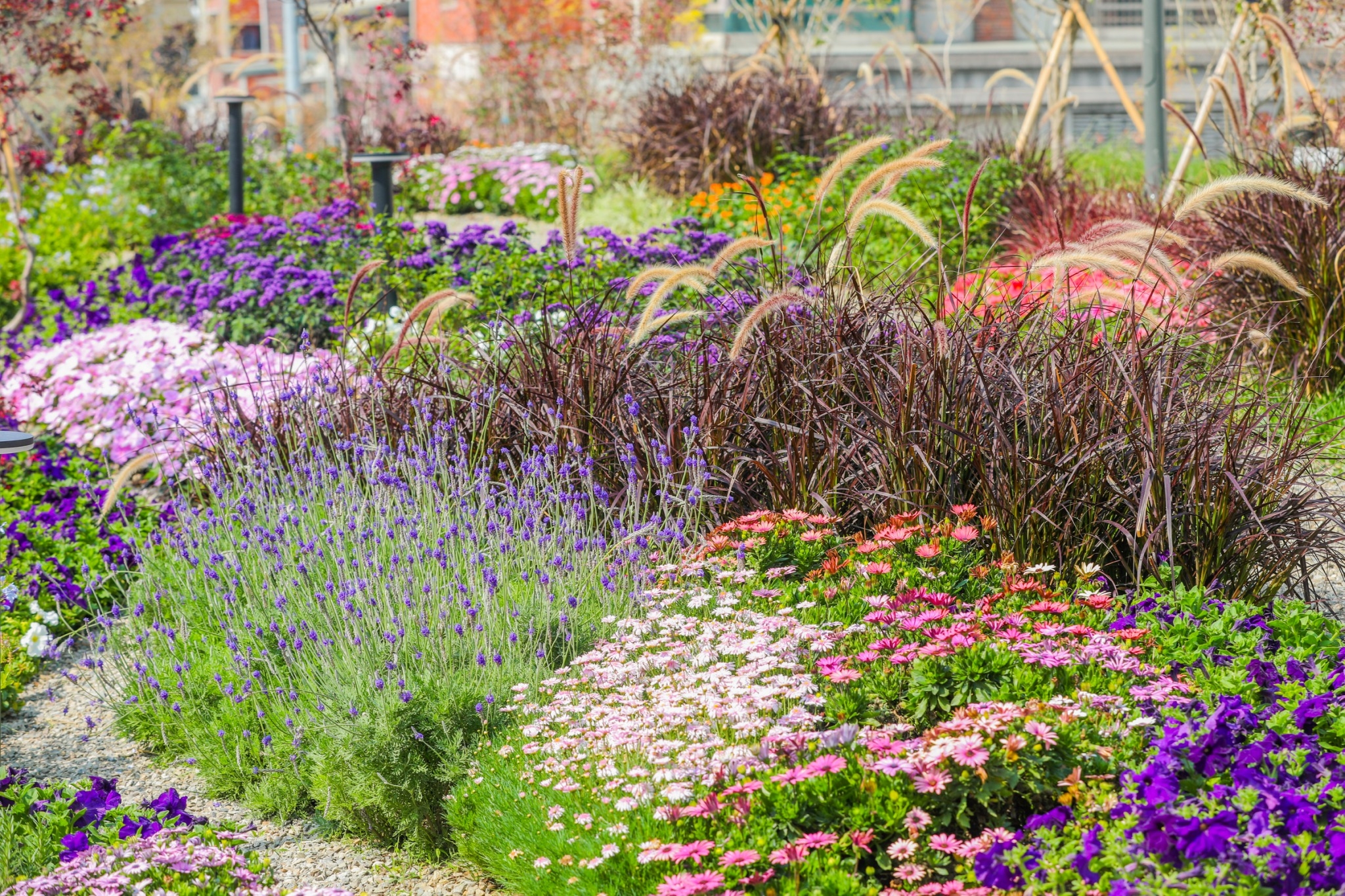 建設局長陳大田說明,「花之道」有別以喬灌木複層及草皮為主的公園景觀設計,採自然庭園概念形塑戶外花園,打破傳統整片花海方式,豐原示範點以「小而美」區塊植栽呈現,並以錯落方式於園道設置愛心裝置藝術,民眾一進到園道就能看見充滿幸福的意象。