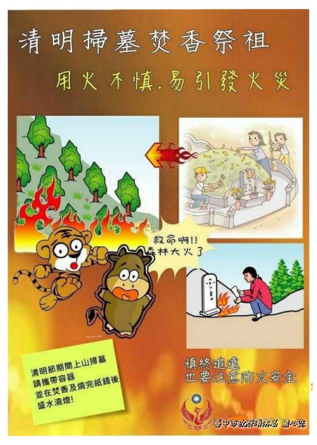 此外,「記得」撲滅餘燼,離開墓地時,應仔細檢查是否有未熄滅的火源,請將餘火澆熄後再離去;「記得」隨手收拾垃圾,維護環境整潔。更多防火觀念及影片,請查詢消防局臉書粉絲專頁 : https://www.facebook.com/tccfwebfans/ 。 (3/18*18)*消防局