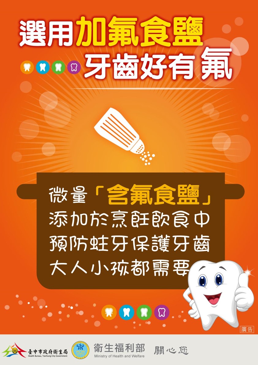 曾局長說明,氟化物具保護牙齒的效果,就像是給牙齒穿上防護衣,衛生福利部自2016年開始推動食鹽加氟政策,顯示齲齒預防率可達50%至70%,但一般食物的含氟量很低,透過含氟食鹽補充食物中攝取不足的氟量,經由人體轉換在牙齒表面形成保護,可加速牙齒成熟的速度,促進初期齲齒再礦化,讓牙齒不易被溶解,以保護牙齒。如家中兒童有臼齒窩溝封填的需求,歡迎查詢衛生局官網公布的施作診所名單 ( https://www.health.taichung.gov.tw/1733799/post ) 。