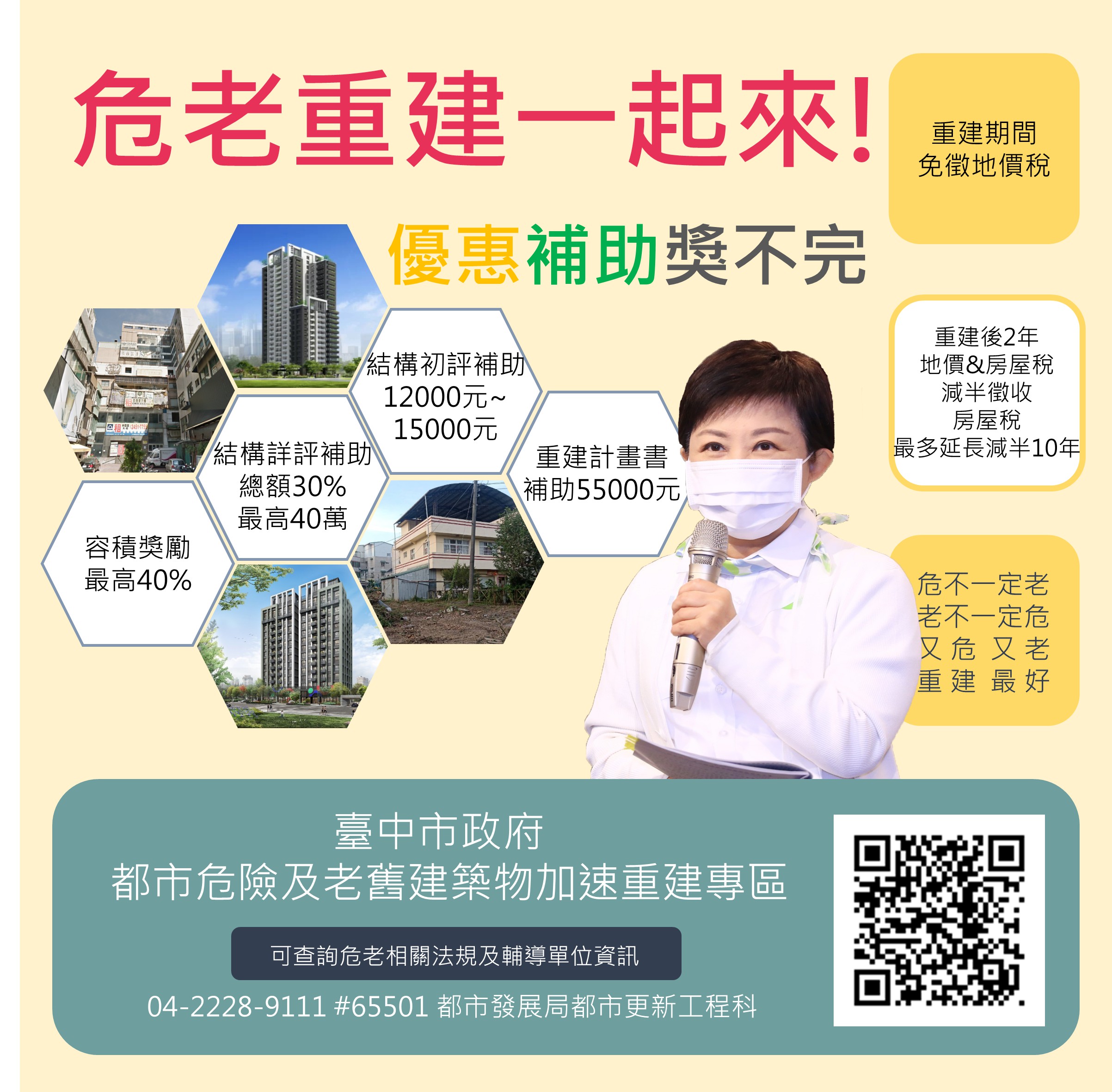 都發局表示,對於想重建卻苦無資金來源的民眾,政府也提供「信用保證」、「利息補貼」及銀行配合「危老融資方案」等相關優惠措施,期盼幫助更多台中市民辦理老屋重建,逐步改善居住環境、提升建築安全與生活品質。
