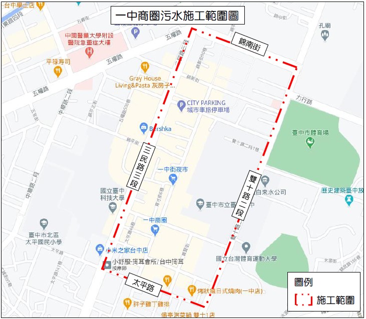 為提升一中商圈環境品質、強化觀光產業競爭力,經過商圈管理委員會及相關單位協調,臺中市政府水利局將於今(110)年3月中旬於一中商圈施作污水工程及用戶接管,水利局將採分期分區施工,並配合商圈營業時間調整施工時間,務求將影響降至最低,並呼籲商家及民眾配合,共同解決商圈髒亂惡臭,提升商圈環境品質。