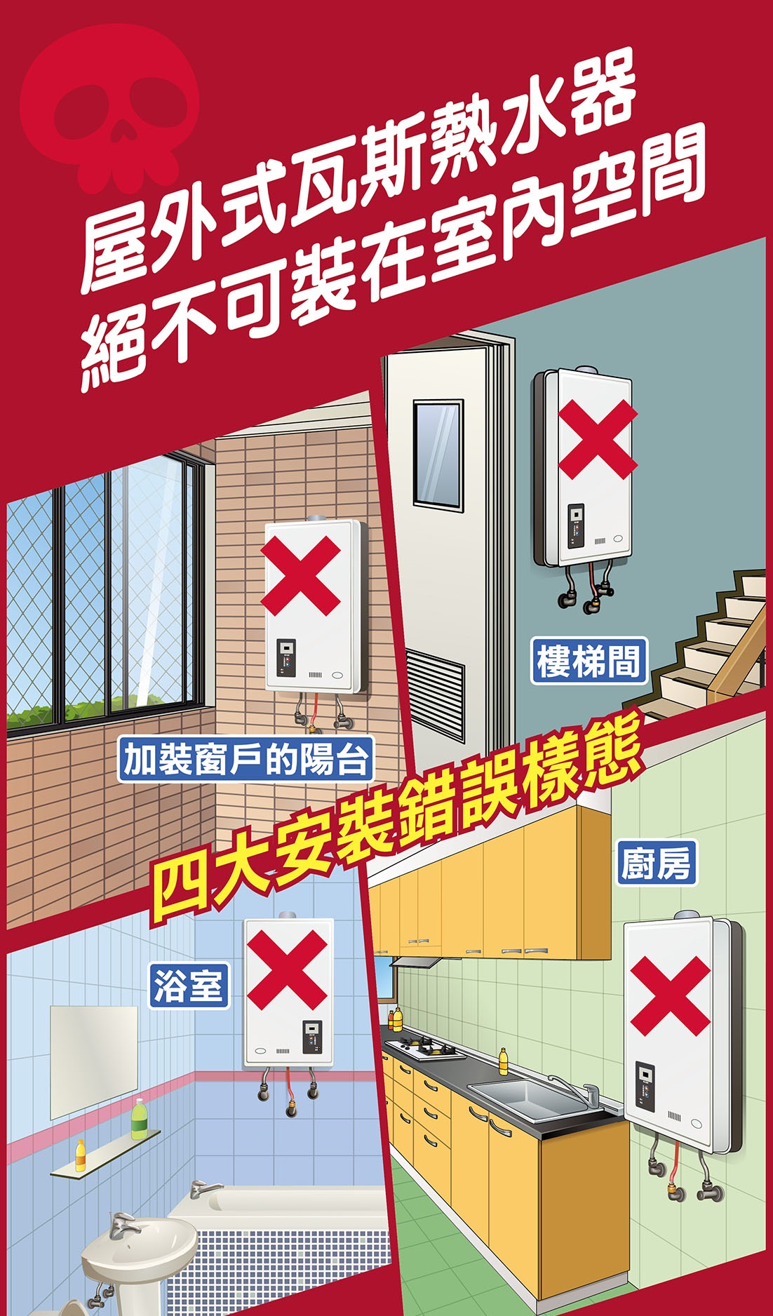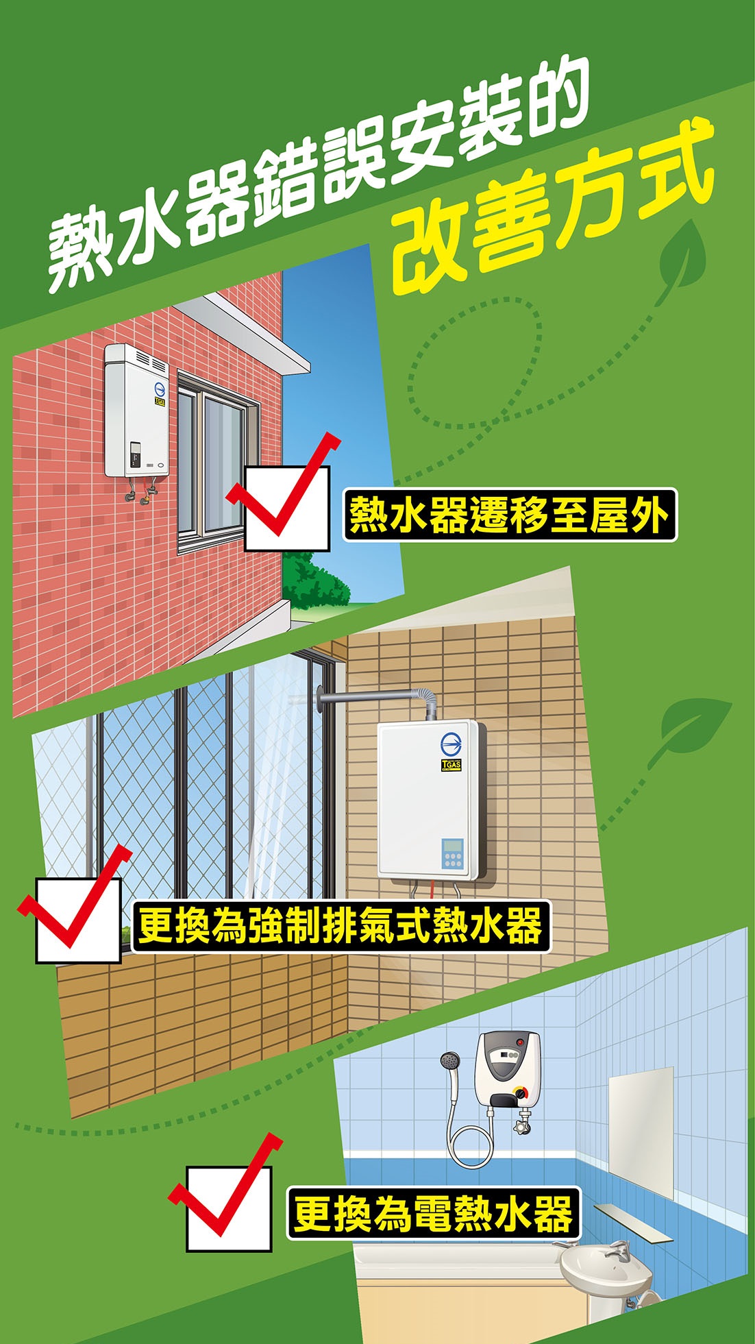 消防局說明,針對居家熱水器,民眾可依照「要環境通風、要合格標示、要正確型式、要安全安裝、要進行檢修」等「五要原則」,自行檢視家中熱水器安裝位置是否安全;若是裝設於室內的熱水器,則應選擇強制排氣型熱水器或電熱水器,避免中毒風險。