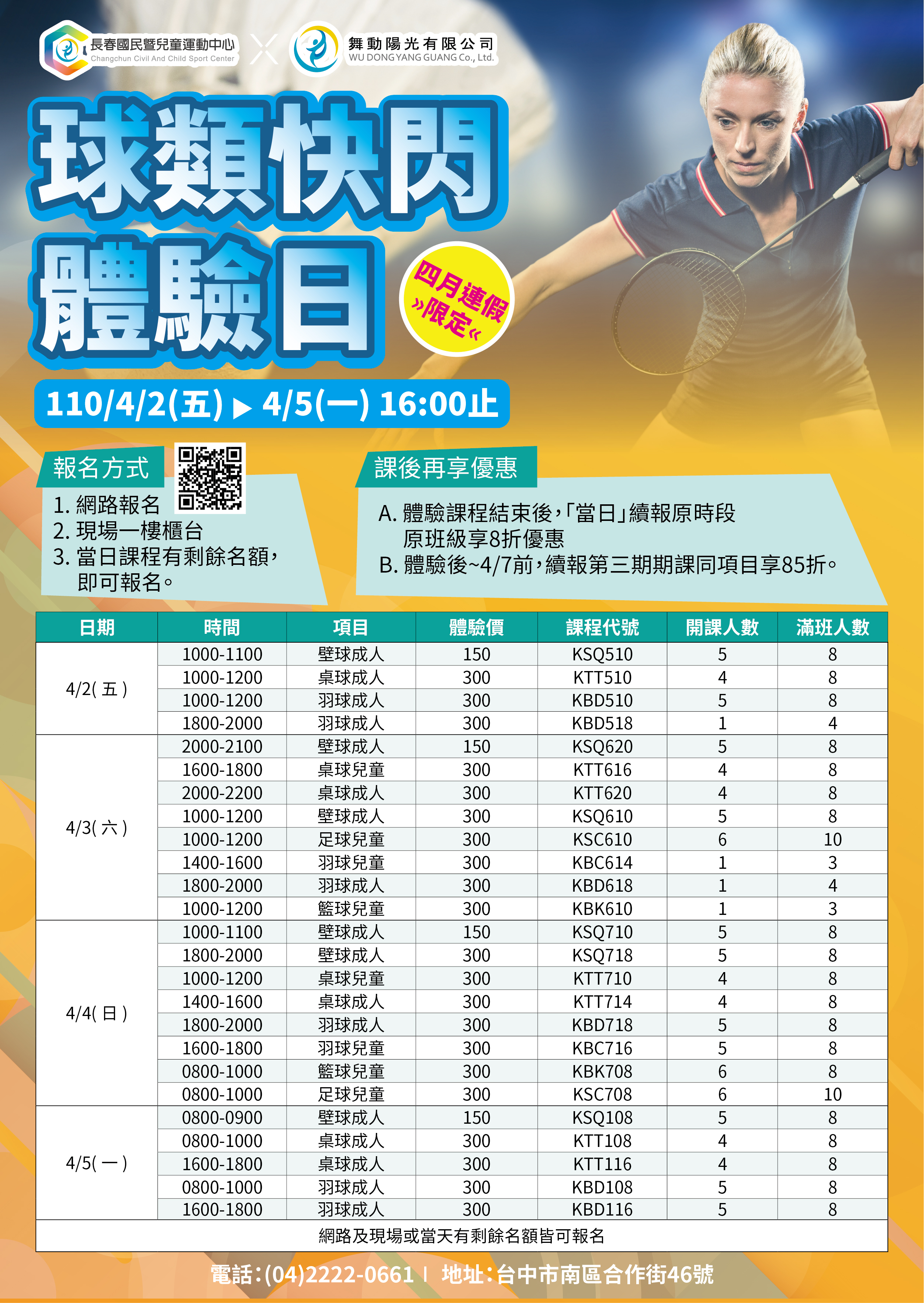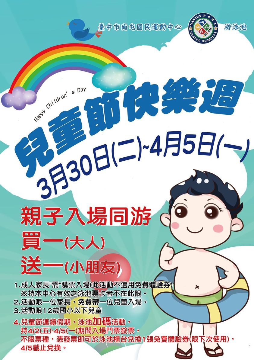 此外,南屯國民運動中心即日起至4月5日訂為「兒童節快樂週」,親子入場游泳享優惠價格,4月2日至5日連假期間憑泳池購票發票還可兌換免費體驗券,並在4月25日下午舉行「親子體適能小小運動會」,邀請家長帶著孩子參加,參與者可享購課85折優惠;長春國民暨兒童運動中心則限定4月2日至5日連假期間為「球類快閃體驗日」,除可以優惠價格體驗各式球類運動課程外,體驗結束後,續報課程還可享8折至85折優惠。