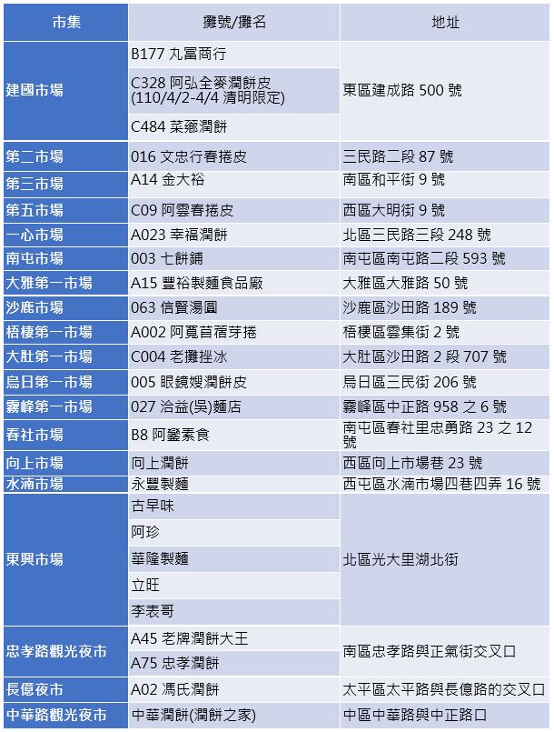 張局長也說,想應景自製潤餅的民眾,推薦走訪台中最大食材集散地建國市場,市場內有專賣Q彈有嚼勁餅皮的「丸富商行」、「阿弘全麥潤餅皮」、「菜薌潤餅」,還有鄰近第二市場的「文忠行春捲皮」、第三市場「金大裕」、第五市場「阿雲春捲皮」及向上市場老字號的「向上潤餅」皆有單賣餅皮,絕對可以滿足潤餅DIY需求。