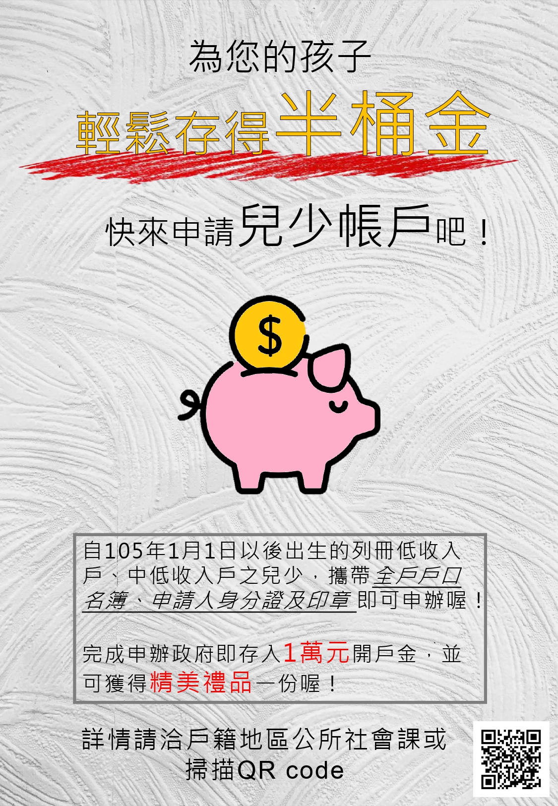 為弱勢兒少累積資金,台中市政府社會局積極推動「兒少發展帳戶」,符合條件的兒童及少年於年滿18歲前,每人每年最高可存15,000元,政府再提撥同額款項。適逢兒童節,福智僧團為弱勢兒少祈福,提供吉祥及祈願禮盒,未開戶的弱勢家庭自5月起至公所申請兒少發展帳戶,即可獲得一份開戶禮。