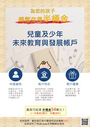 社會局表示,兒少發展帳戶是針對105年1月1日以後出生的列冊低收入戶、中低收入戶,或長期安置的兒童及少年,年滿18歲前,每人每年最高可存15,000元,政府再提撥同額款項,期盼透過儲蓄帳戶模式,為兒少累積基金,增加未來接受高等教育及生涯發展的機會,減少貧窮代間循環問題,扶助弱勢家庭自立。