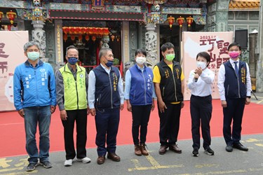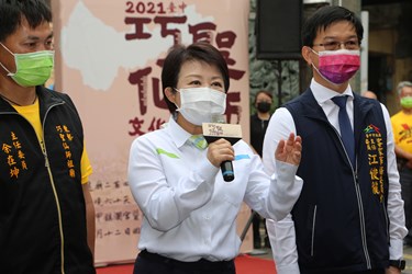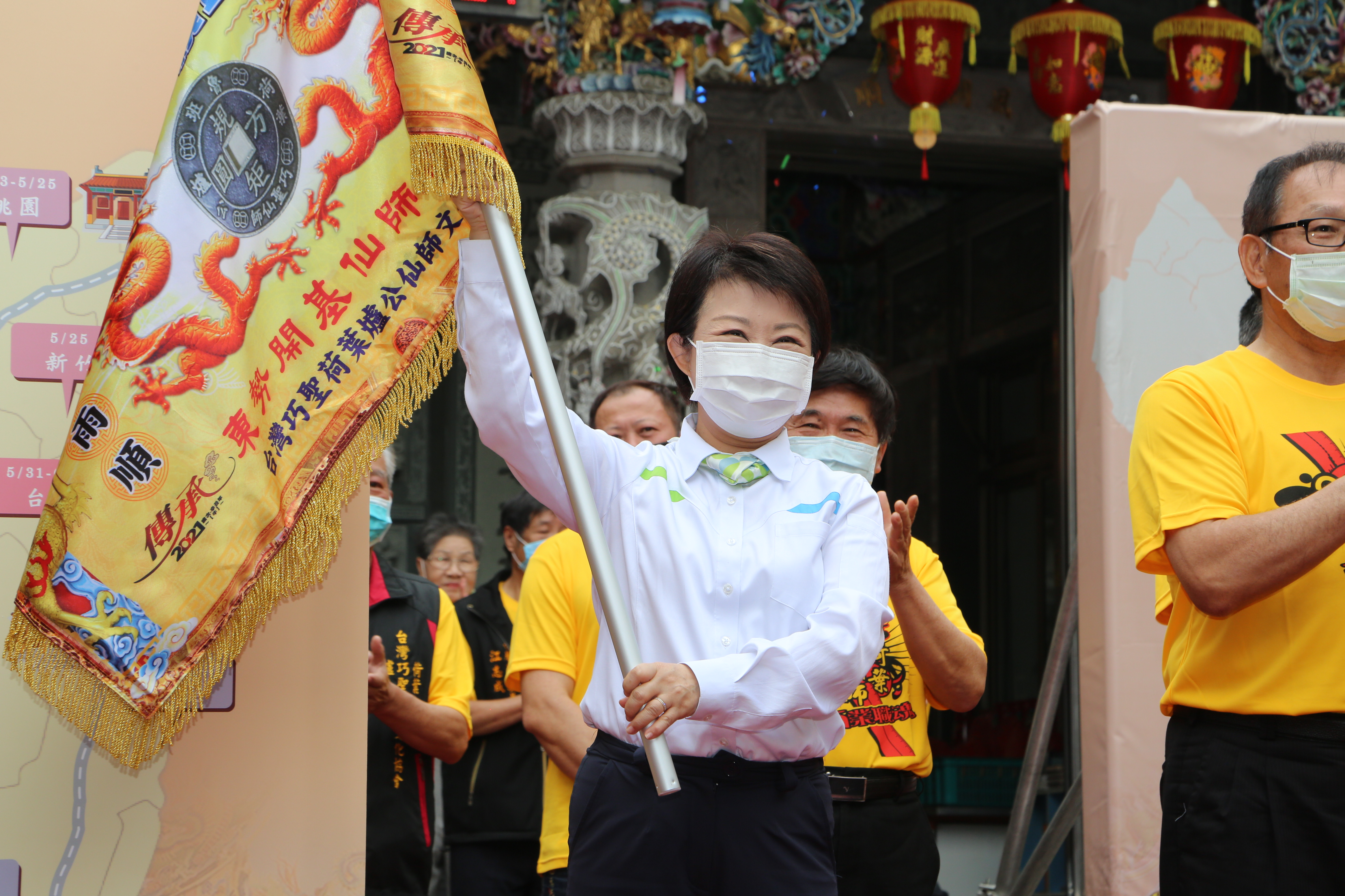 台中市政府客家事務委員會今日在東勢巧聖仙師廟舉辦「2021巧聖仙師文化祭」遶境活動記者會,盧市長將活動錦旗交接給巧聖仙師廟管理委員會主委余在坤,並由17個縣市宮廟代表依遶境路線傳遞,一同為巧聖仙師廟祈福遶境活動揭幕。