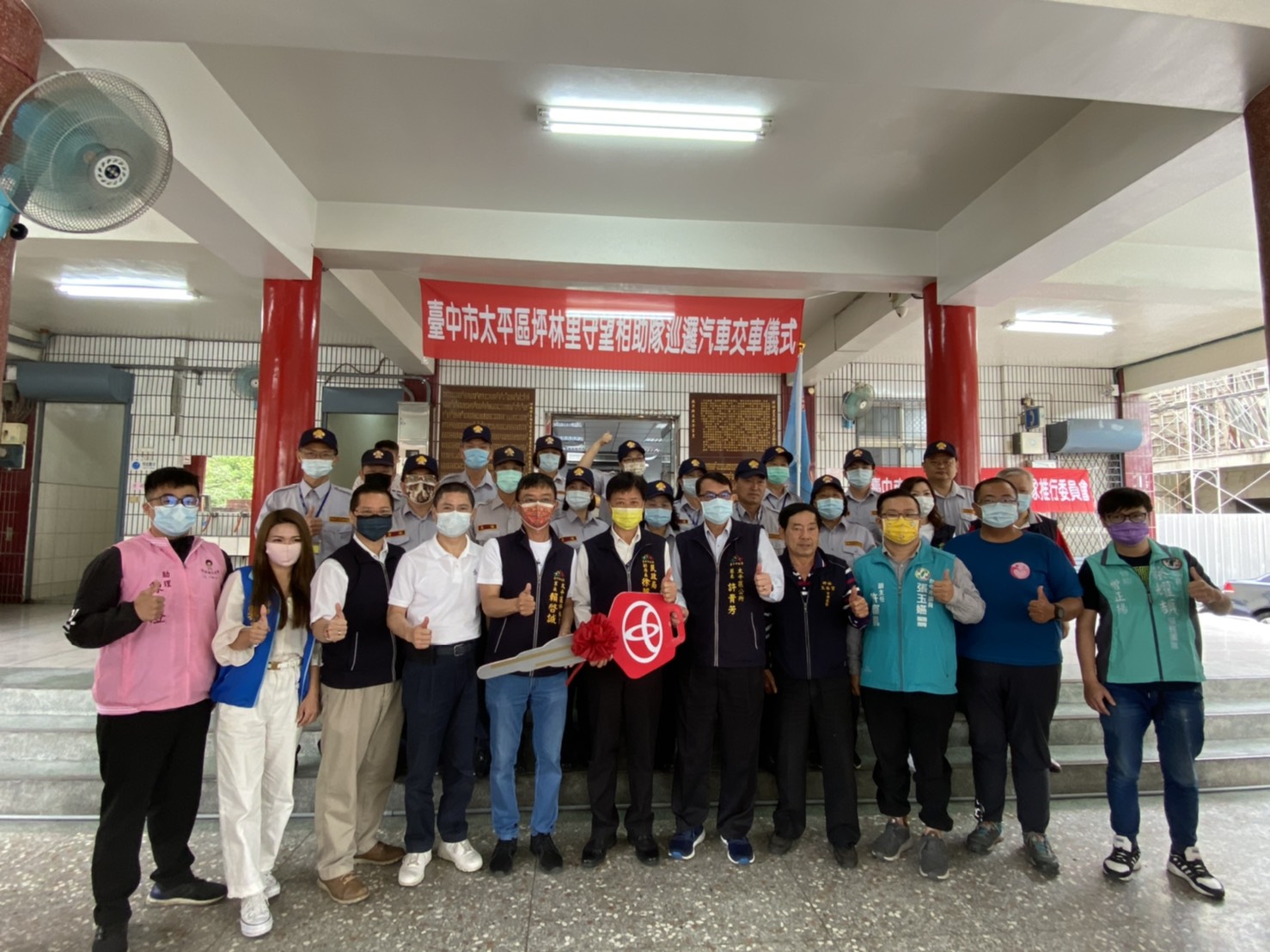 強化守望能量!台中市政府補助太平區坪林里守望相助隊,購置巡邏汽車1輛,今(8)日在坪林里玉林宮前舉辦交車典禮,民政局副局長徐照山代表市長盧秀燕主持交車儀式,感謝守望相助隊守護居民生命財產安全,期盼藉此提高隊員巡邏安全並增進巡邏效能。
