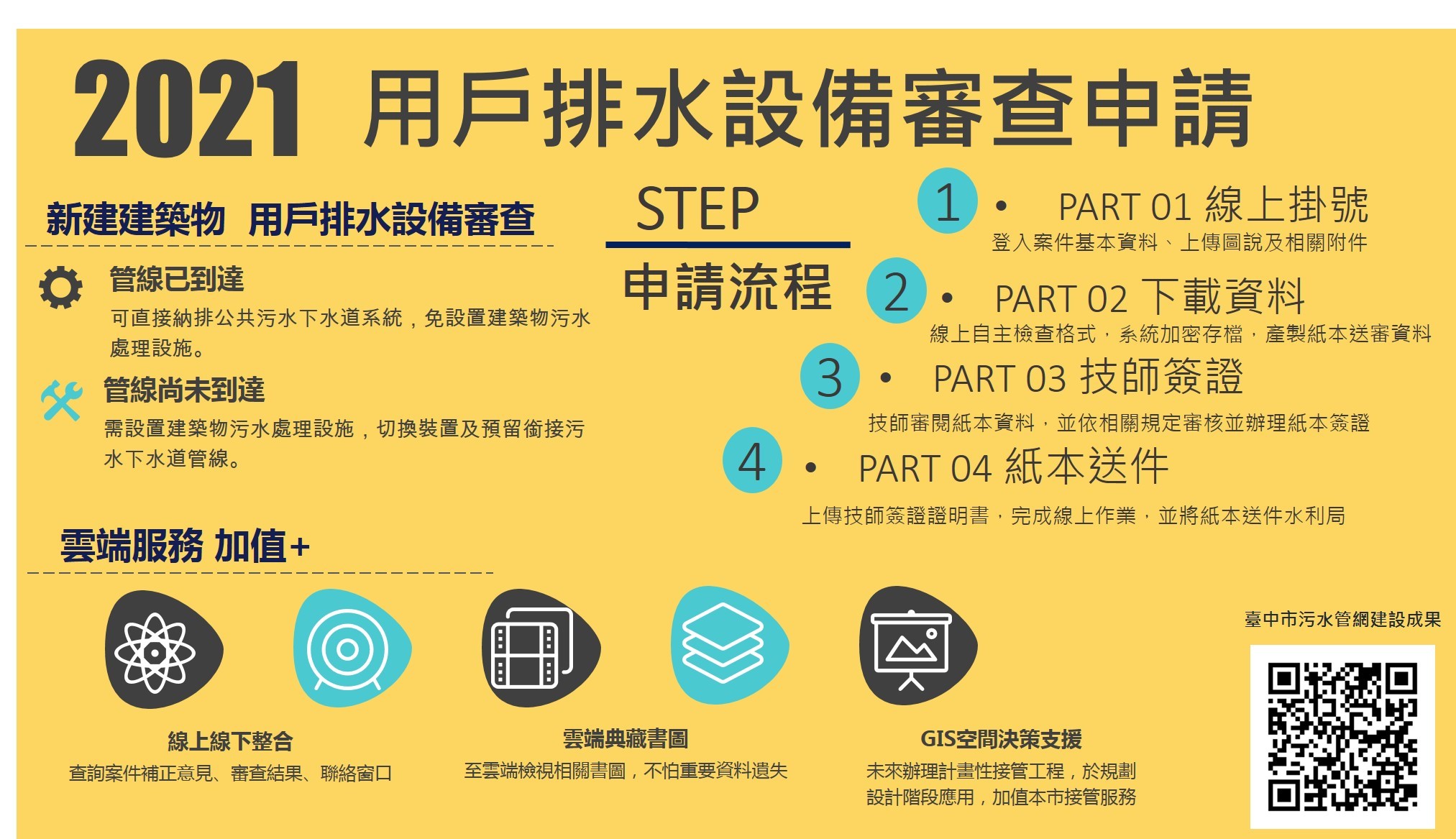 水利局表示,污水下水道為都市現代化程度之重要指標,亦為改善都市污染及環境衛生,及提高國民生活品質之具體措施。凡位於本市污水下水道公告特定地區之新建、增建或改建之建築物,於建照開工及使照核發前,須申請用戶排水設備審查及竣工查驗,中市排水設備審查案件隨都市發展逐年增長,水利局除提供跨領域、全方位污水接管服務,因應數位資訊化時代及防疫期間,也結合創新與科技,民眾辦理用戶排水設備審查,可透過線上申請系統直接進行登錄即可隨時查詢進度。