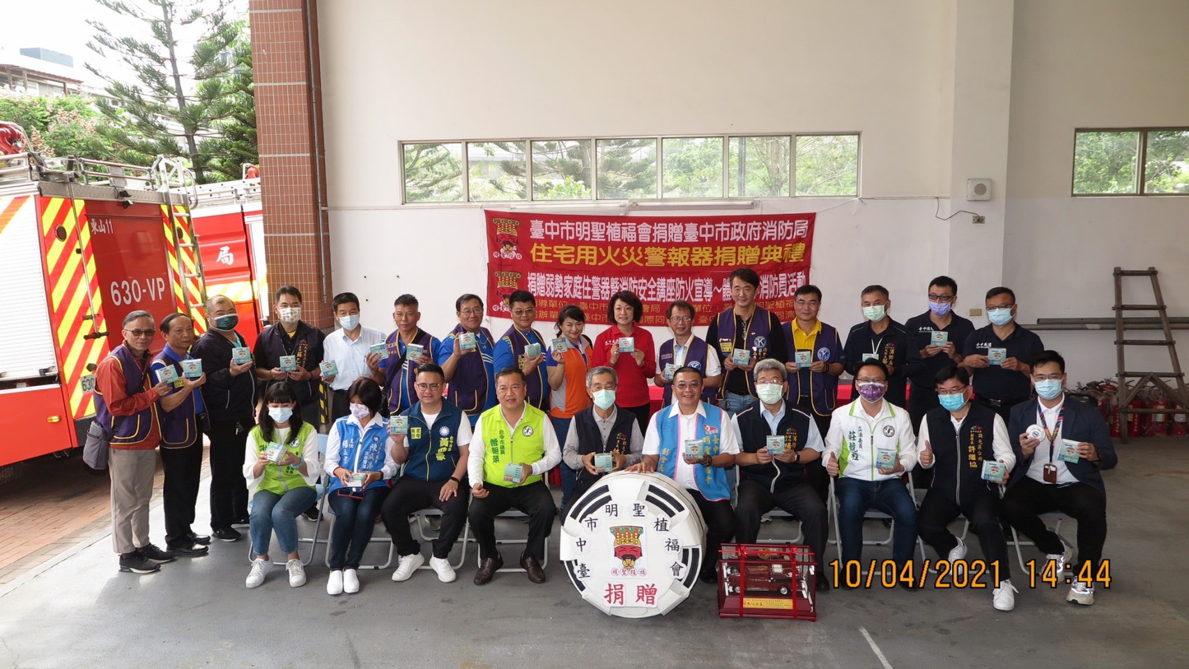 台中市明聖植福會偕南屯國際同濟會及植福國際同濟會捐贈600顆偵煙式住宅用火災警報器予台中市政府消防局,將優先提供東山分隊所轄弱勢團體裝設,昨(10)日於東山分隊舉辦捐贈儀式,由消防局簡任技正楊純凱代表受贈,並回贈消防紀念模型車及感謝狀給明聖植福會會長陳義德。