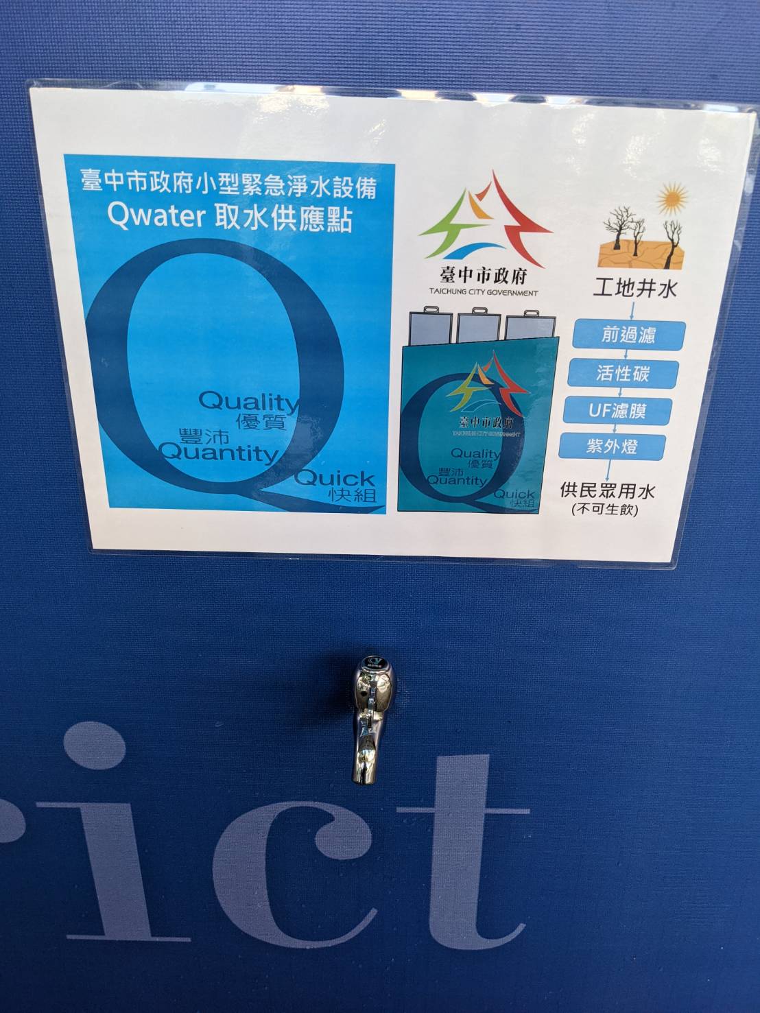 水利局表示,第1部小型移動式淨水設備已設置於本市南屯區文心南路及文心南五路交叉口的「文心愛悅」建築工地,在市府都市發展局協調下,建築工地起造人(興富發建設股份有限公司)很願意基於公益並善盡企業社會責,全額支付設備運轉所產生的電費,另外為維護民眾取水時安全及便利,取水口設置於文心南路人行道處,每日可產出約15噸的民生用水,其水質為飲用水標準,但飲用前請先煮沸,不可直接生飲,同時也呼籲民眾節約用水。
