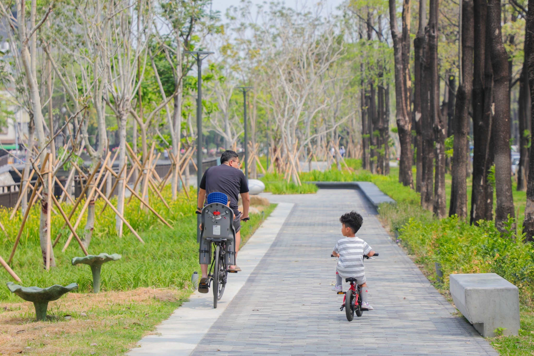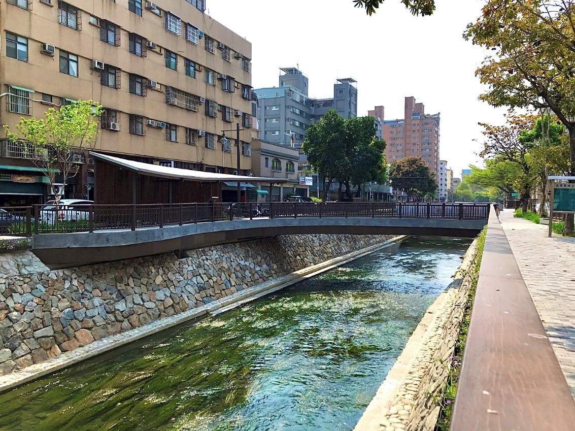 台中市「綠川」貫穿中、西及南區,河道長5.7公里,市長盧秀燕上任後加強綠色工法整治,將工程延伸至南區,包括興大段(信義南街至忠明南路)、長春運動中心段(愛國街至信義南街)及綠空鐵道段(民權路至復興路)皆已完工,今(14)日同步啟用,採低衝擊開發工法及海綿城市概念,減少水泥構造外型,藉由污水截流改善水質;復興園道更新設「水淨樂園」主題遊戲區,寓教於樂打造美麗水岸景觀。