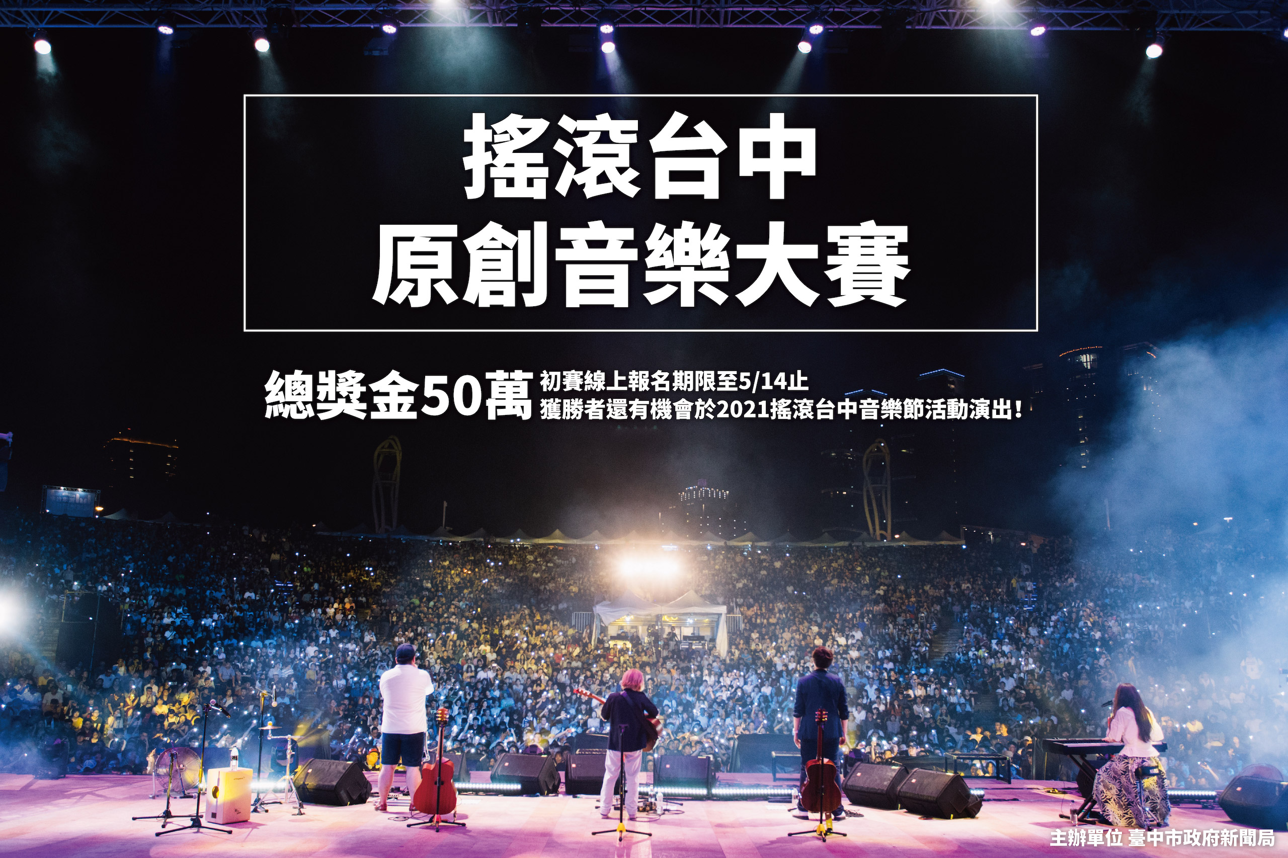由台中市政府新聞局主辦的「搖滾台中」音樂祭,是搖滾樂迷每年超期待的重要音樂盛事,目前正緊鑼密鼓籌備中,為振興受疫情影響的音樂產業,今年特別舉辦暖身活動「原創音樂大賽」,全國各縣市音樂創作團體皆可參加,初賽徵件自即日起至5月14日中午12時止,總獎金高達50萬元,歡迎踴躍報名。