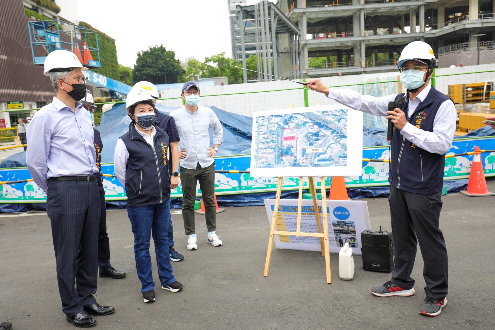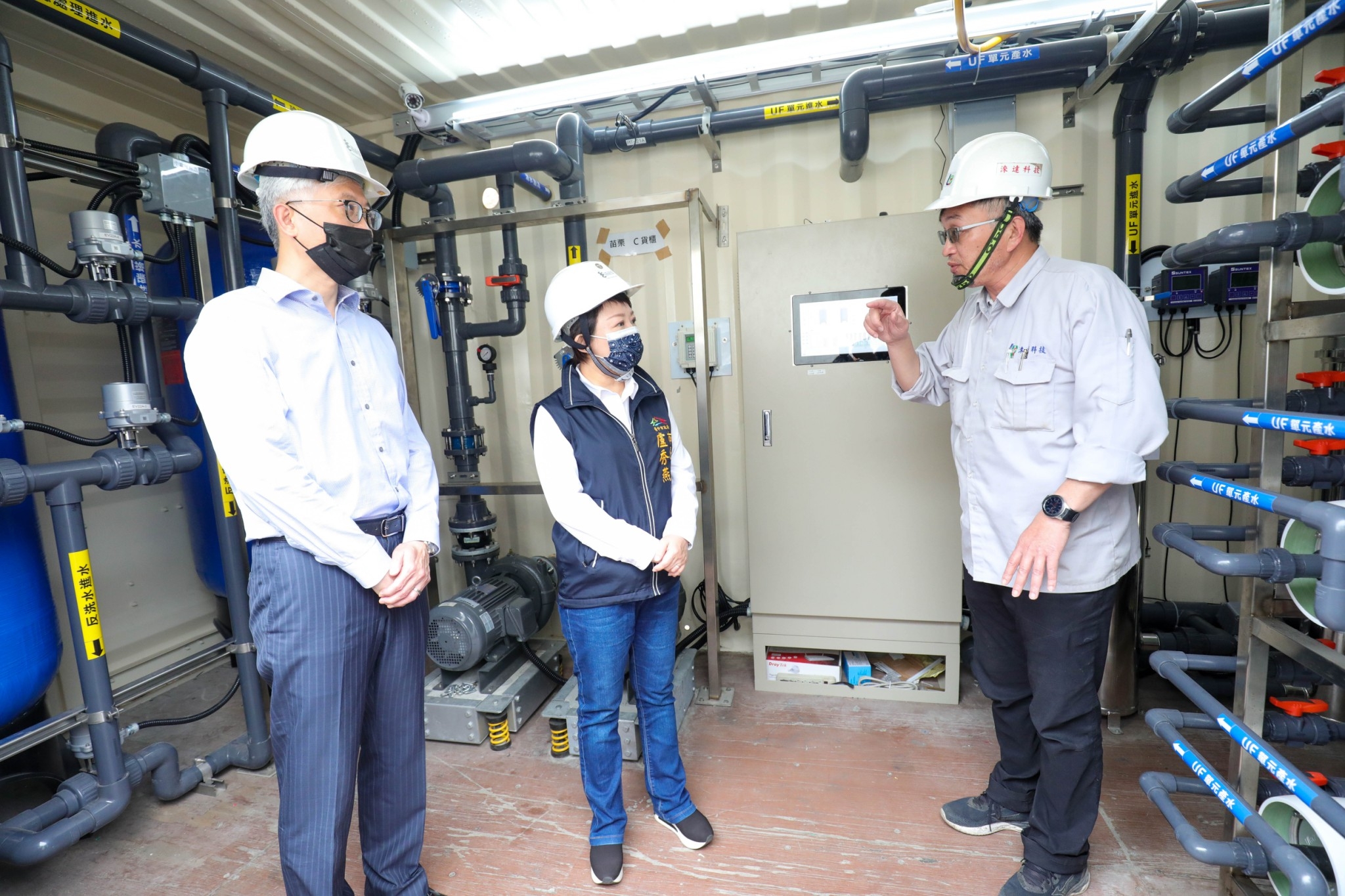 盧市長今日在經發局長張峯源陪同下前往視察,台灣自來水公司總工程師李丁來進行淨水設備設置說明簡報,環保局也現場抽測水質,初步合格。她表示,台中地下水資源豐沛,新建工地於開發建設時,地下水會不停湧出,是非常珍貴的水資源,市府盤點65處工地,從今年1月起至4月15日累計提供約2萬6,730噸產業用水,提供給經濟部調撥使用處理為民生用水。
