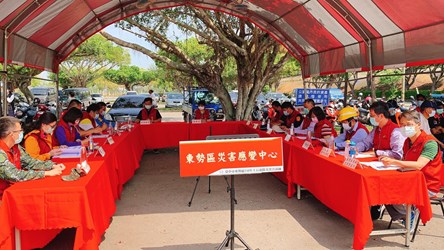 本次演習與往年最大不同,為假定汛期土石流災害發生時又遇上地震之複合性災害,從發布颱風警報、整備成立災害應變中心,動員各編組進駐待命,啟動災害防救機制,於災害預警時之緊急應變及通報機制,包含里辦公處災前防災宣導及預防、土石流自主防災社區組織動員,到發布土石流黃色警戒辦理預防性疏散撤離、收容安置民眾,發布土石流紅色警強制撤離民眾,因土石流沖刷又遭逢地震襲擊,至發生道路中斷,緊急進行道路搶通及醫療救援,各項維生管線因颱風受損,相關單位及時派員搶救、復舊、復原等,囊括各項災害模擬、預防、救援通報機制之運作,充分展現東勢區應變中心之應變能力。