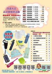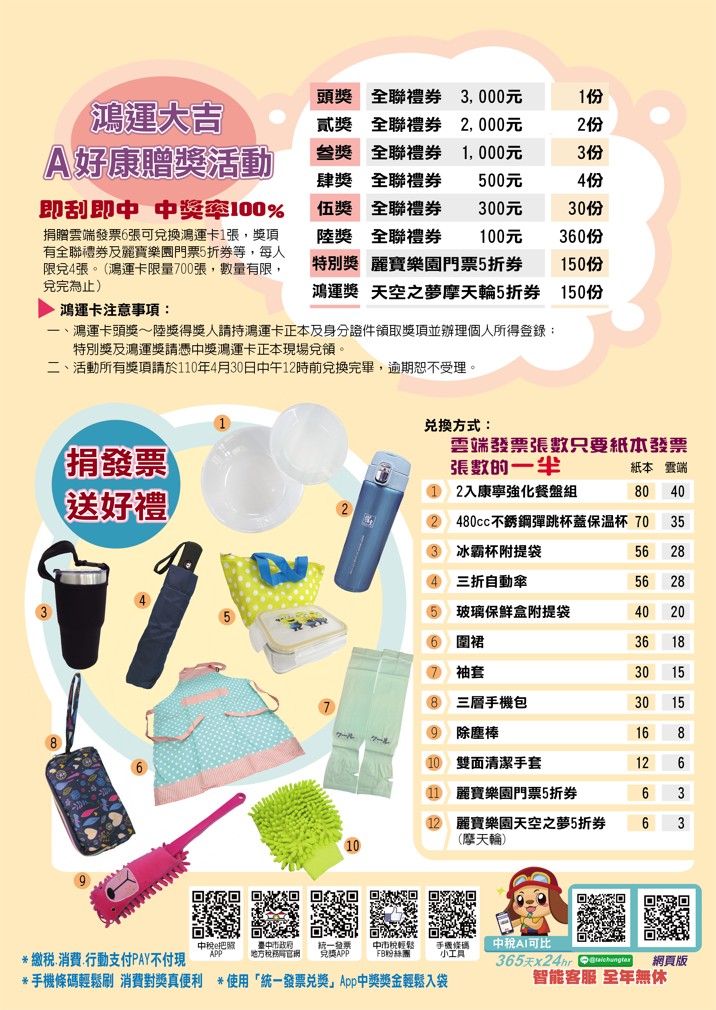 稅務局指出,為鼓勵民眾使用雲端發票,加碼推出鴻運大吉A好康活動,捐贈雲端發票6張就可兌換鴻運卡1張,即刮即中,中獎率100%,每人限兌4張,可刮中3,000元至100元不等全聯禮券及麗寶樂園門票5折券等;另外還有「牛轉乾坤歡樂轉~大型轉盤遊戲」,民眾須正確回答稅務問題才可兌換,相關募集發票全數捐給公益團體。