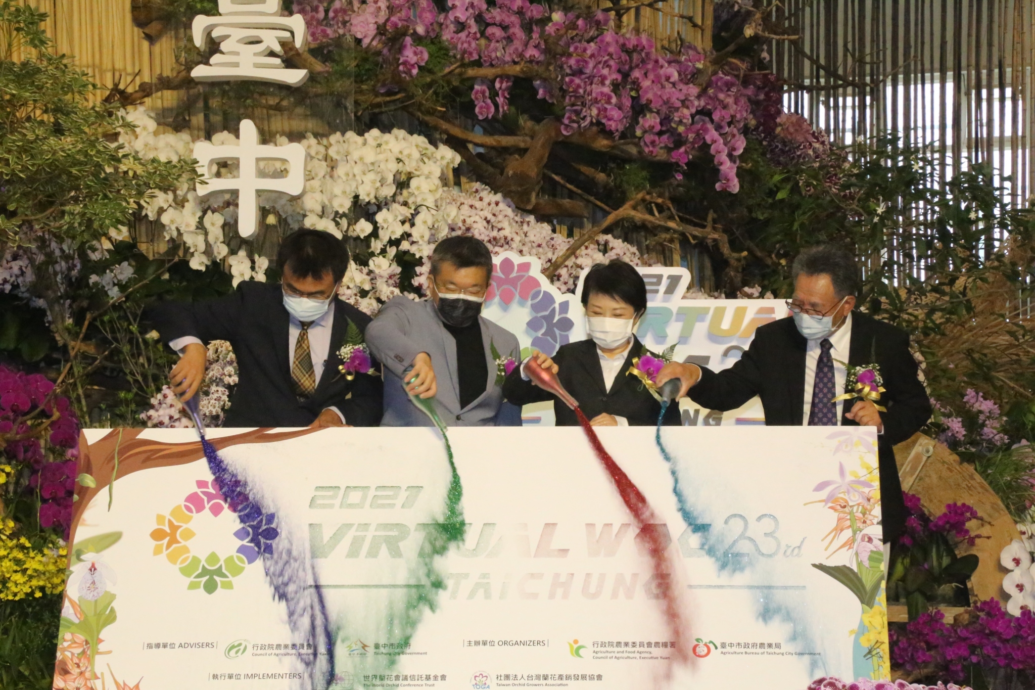 今日開幕式在花博外埔園區樂農館盛大登場,由市長盧秀燕、行政院農業委員會主任委員陳吉仲、立法院副院長蔡其昌、台灣蘭花產銷發展協會理事長陳澄鐘,一同為「世界蘭展、花漾台中 2021 Virtual WOC Taichung」揭幕。