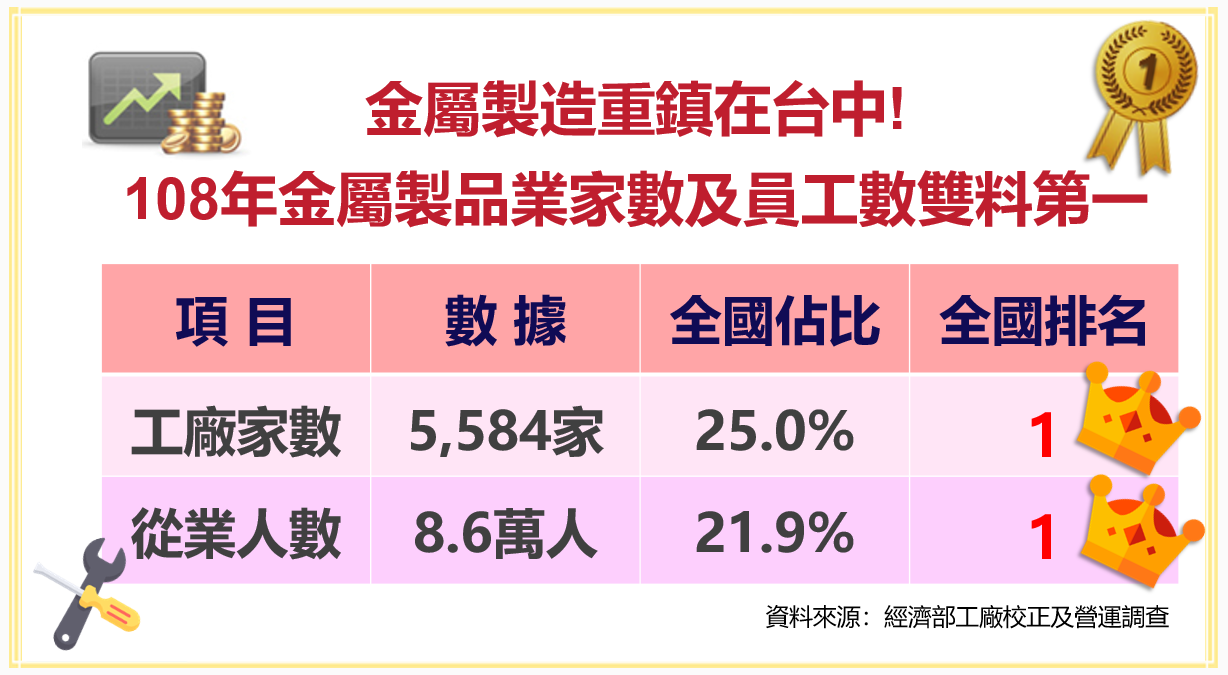 台中市擁有金屬製品產業最大聚落,108年金屬製品業工廠計5,584家,占全國金屬製品工廠超過四分之一,為金屬製品業最密集的地區,且從業員工人數8.6萬人佔比高達全台21.9%,工廠家數及從業員工數均為全國第一,透過利基市場建立優勢,早已跳脫金屬產業傳統黑手形象,發展成具有高附加價值、高技術含量、高智慧化的產業型態。