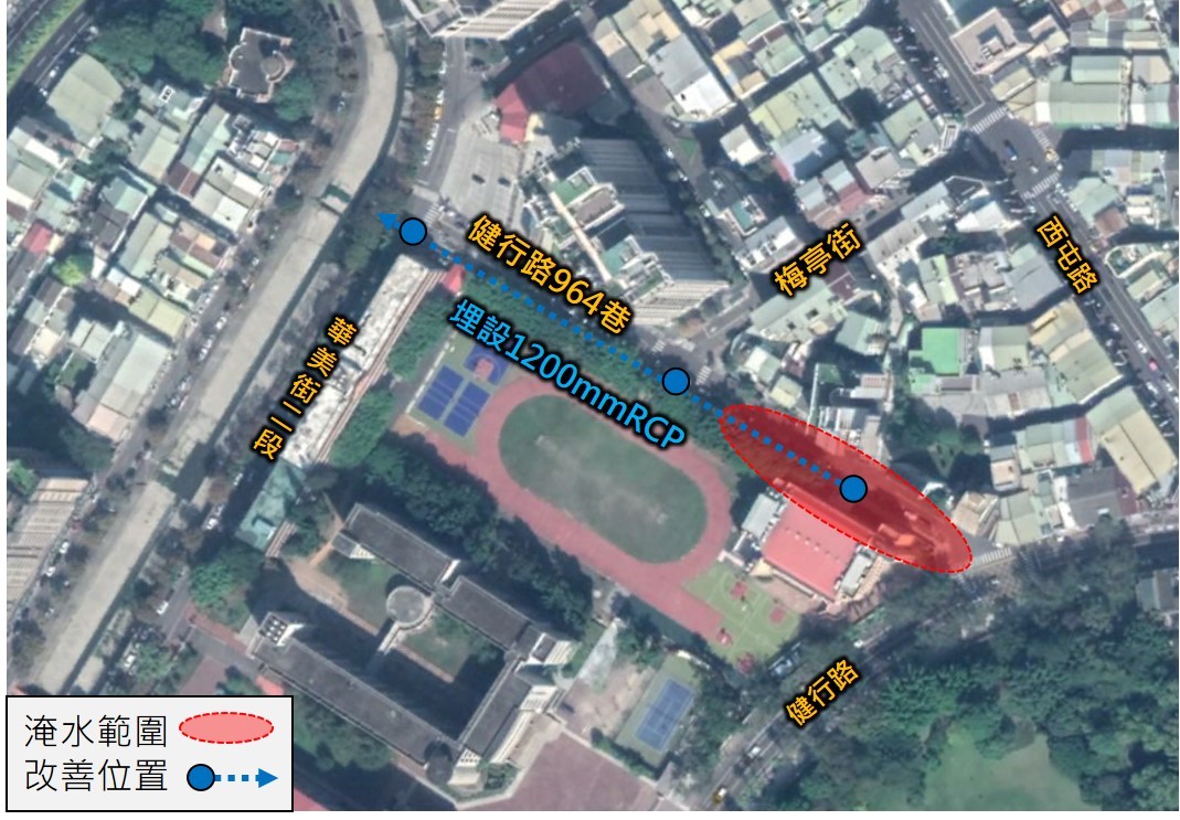 另健行路964巷低漥地區每逢豪大雨時,巷內常有淹水情形,為改善淹水情形施作雨水下水道,長度約189公尺,經費約730萬元整,改善積淹水面積約0.33公頃。