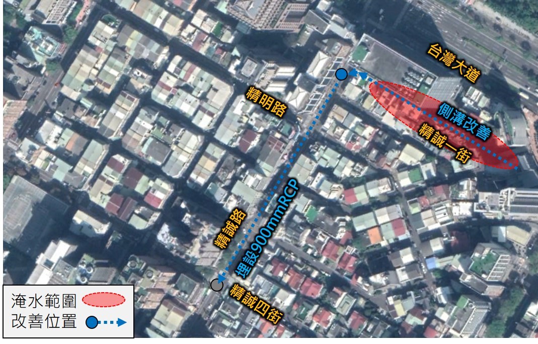 水利局表示,精誠路周遭部份區域地勢較平緩,每逢豪大雨時側溝水流無法快速宣洩,導致積淹水情況發生,因此將延伸下水道系統及重新施作精誠一街道路側溝,以改善該路段積淹水問題,總長度約157公尺,經費約530萬元整,改善積淹水面積約0.27公頃。