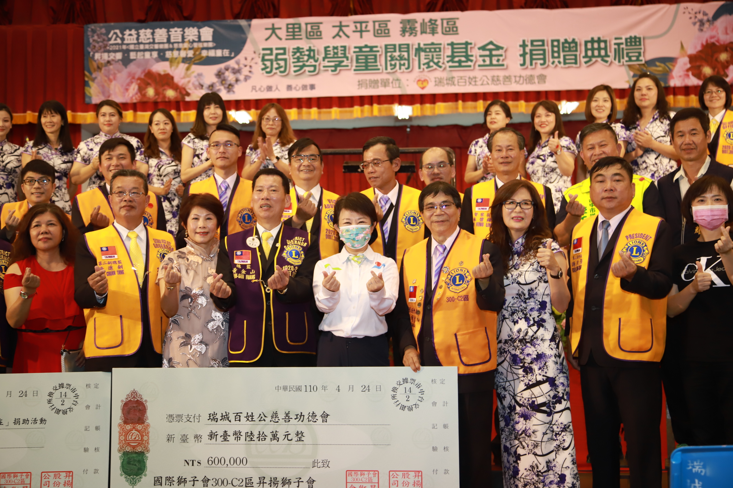 台中市大里區瑞城百姓公慈善功德會、昇揚金屬股份有限公司及昇揚獅子會今(24)日在瑞城國小舉辦「馨愛交響・藝起童享」公益慈善音樂會,並捐贈市府消防局救護車一輛與地方弱勢學生共462萬元善款回饋公益。台中市長盧秀燕出席代表市府受贈,感謝社會善心,也期勉這項義舉能發揮拋磚引玉效果,讓愛廣布台中。