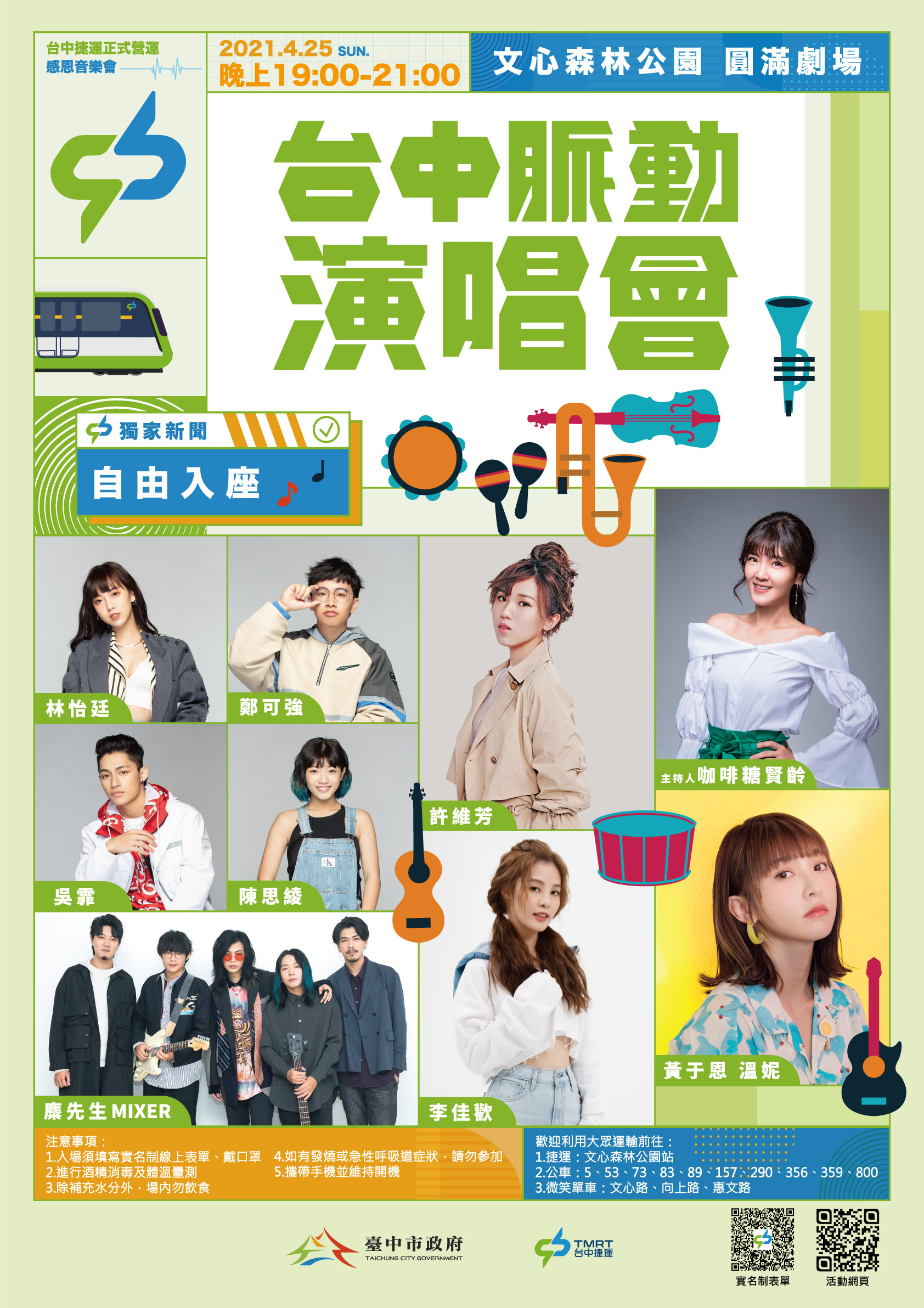 此外,知名選秀節目出生的《聲林之王》穿透系女聲李佳歡、畢業歌女神許維芳、唱跳舞姬牙牙林怡廷、嘻哈新勢力吳霏、溫暖男聲鄭可強、國民妹妹陳思綾也在脈動演唱會中熱力登場;其中,李佳歡、許維芳將共同演唱經典歌曲《如果的事》,象徵台中捷運與民眾彼此分享生命中重要時刻;吳霏更在演唱會中發表尚未面世的全新創作,高歌出迎接新生的台中捷運。