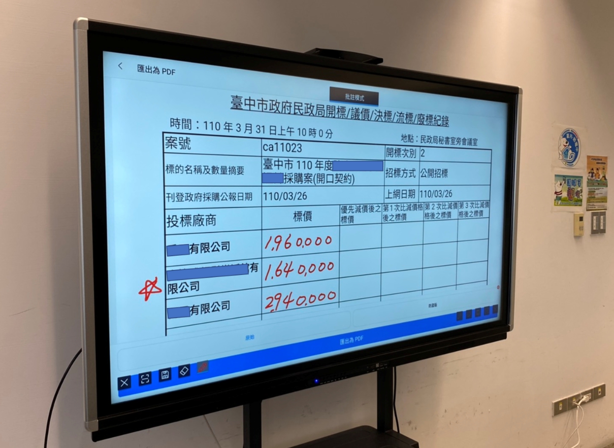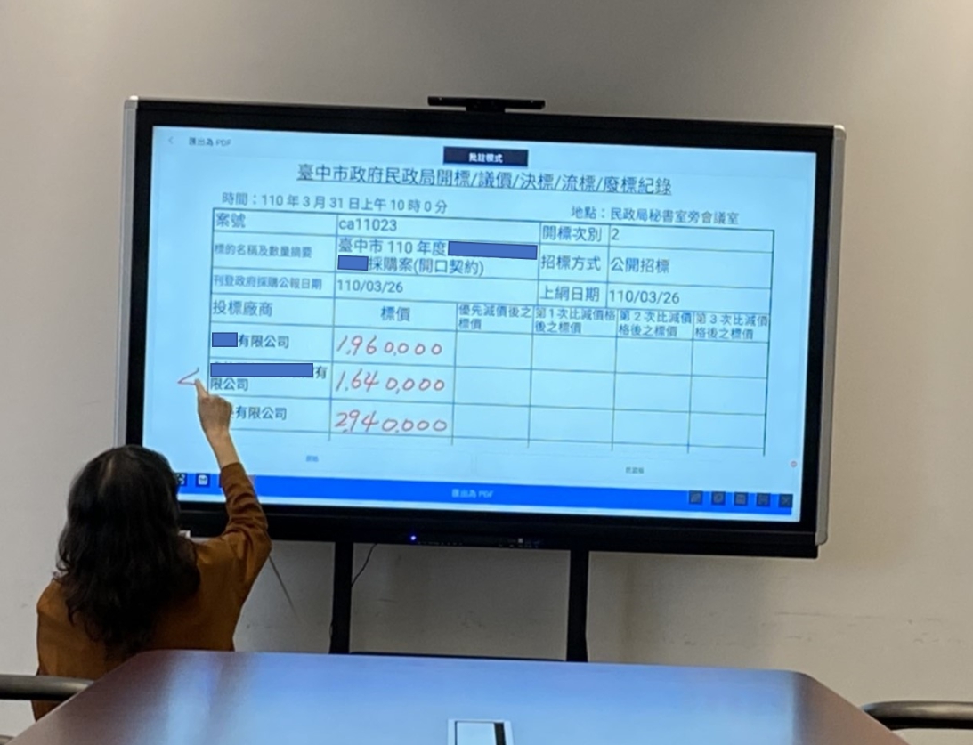 吳局長並說明,「開標室」新設置多媒體設備,改變過去一一唱標廠商報價模式,透過多媒體設備呈現標案資訊,讓到場廠商一目了然,使開標作業更公開透明。此外,多媒體設備並具備觸控面板、無線遠端操作、即時連線上網等功能,提供廠商更完善的簡報設備,進而提升簡報品質,讓簡報內容能以更活潑、便捷的方式呈現,全面提升採購品質與效率。