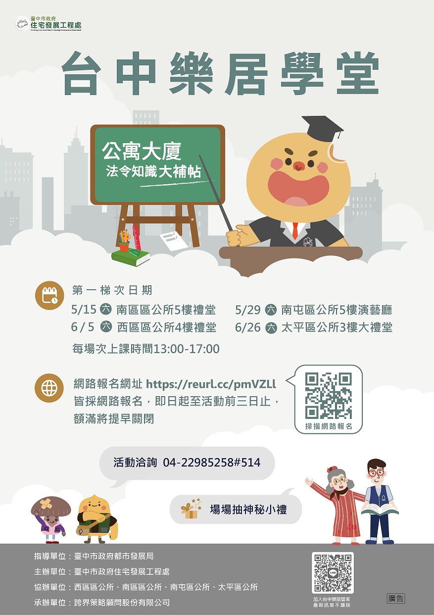 住宅處表示,台中樂居學堂去年辦理3場次,迴響熱烈,吸引500餘位關心公寓大廈事務民眾參與,今年與各區公所合作擴大辦理11場次,配合民眾作息各場皆定於假日下午辦理,前四場分別於515(南區區公所)529(南屯區公所)65(西區區公所)626(太平區公所)舉行,其餘場次訊息預計於六月下旬發布,即日起開放報名至活動前3日止(額滿將提早關閉報名網頁),歡迎民眾上網( https://reurl.cc/pmVZLl )報名。