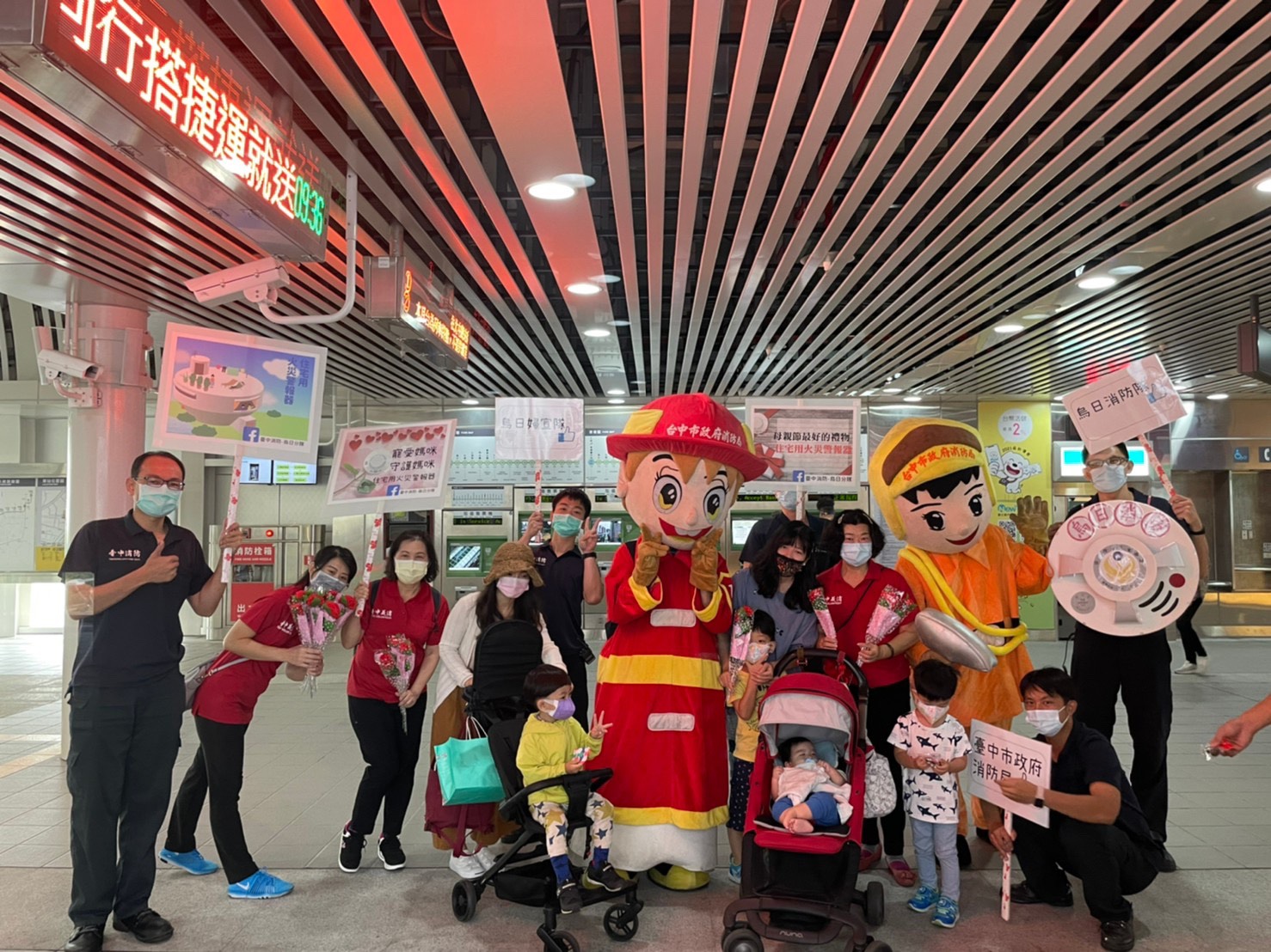 台中捷運綠線通車後吸引民眾搭乘,其中運量最多、人潮最密集的站點就屬三鐵共構的「高鐵台中站」莫屬,因此消防局同仁選擇在此戰進行宣導活動,他們舉著寫著「最佳母親節禮物」的宣導牌,一一向路過民眾發送康乃馨、說明住宅用火災警報器用途,民眾也熱情與同仁、消防寶寶合影留念,為溫馨五月天開啟美好的起點。