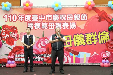 溫馨五月天!台中市大甲區公所今(5)日在公所六樓禮堂舉辦「慶祝110年母親節暨模範母親表揚活動」,向勞苦功高的母親獻上最高敬意。副市長陳子敬代表市長盧秀燕出席表揚大甲區29位模範母親,逐一頒發「母儀群倫」獎牌感謝她們辛勞付出,他提醒子女們可多陪伴家人,向母親說聲母親節快樂,也預祝所有媽媽們美滿幸福。
