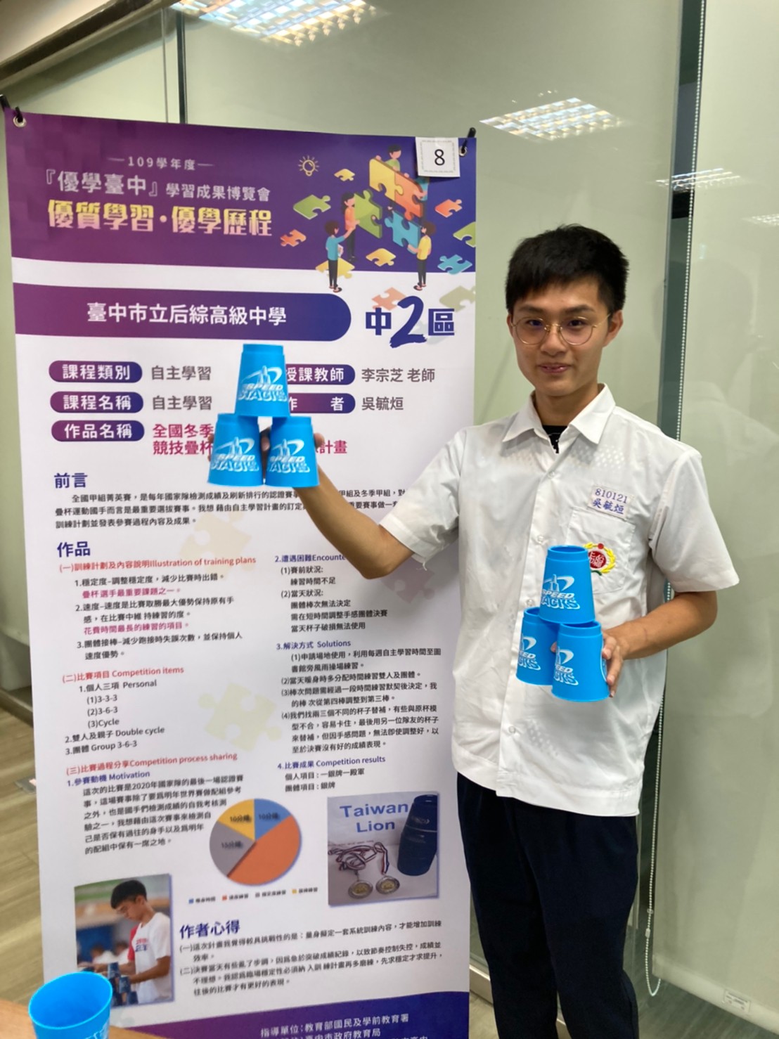 教育局指出,參加博覽會的學生充分展現新課綱強調的素養能力,例如后綜高中疊杯國手吳毓烜同學擬定「全國冬季甲組競技疊杯運動錦標賽訓練計畫」及加強表達力訓練的自主學習計畫;他曾在2014、2016、2017、2021年參加國際賽事,比賽成績優異,在閒暇之餘會透過學校活動組或家扶基金推廣疊杯,讓弱勢族群認識疊杯運動。吳毓烜說,透過做公益活動及疊杯課程,可以從不同層面更認識疊杯。