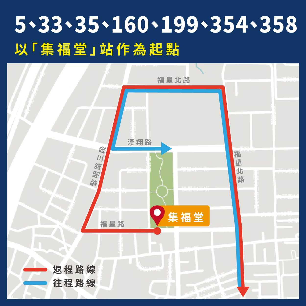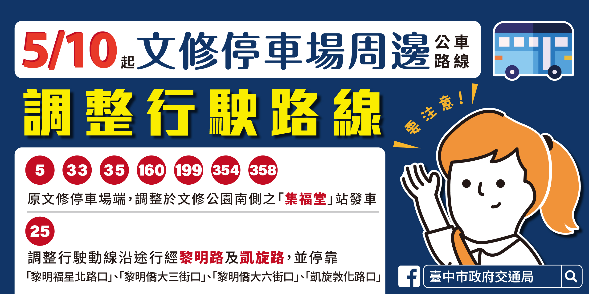 交通局表示,調整的公車路線中,5、33、35、160、199、354、358路往文修停車場方向,仍維持以文修公園北側漢翔路的「文修停車場」站為終點,但發車起點調整至文修公園南側福興路的「集福堂」站,行駛動線由原本「漢翔路-黎明路」調整為「福星路-黎明路」。