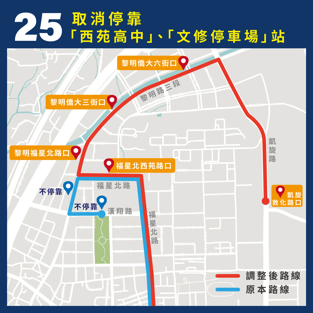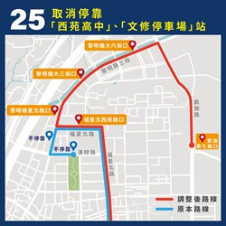 另因應中央公園啟用,周邊建設逐漸發展,民眾至此休憩、旅遊的乘車需求日益增多,因此25路行駛動線改調整為「黎明路-凱旋路」,並增加停靠「黎明福星北路口」、「黎明僑大三街口」、「黎明僑大六路口」及「凱旋敦化路口」站,強化中央公園聯外大眾運輸服務。