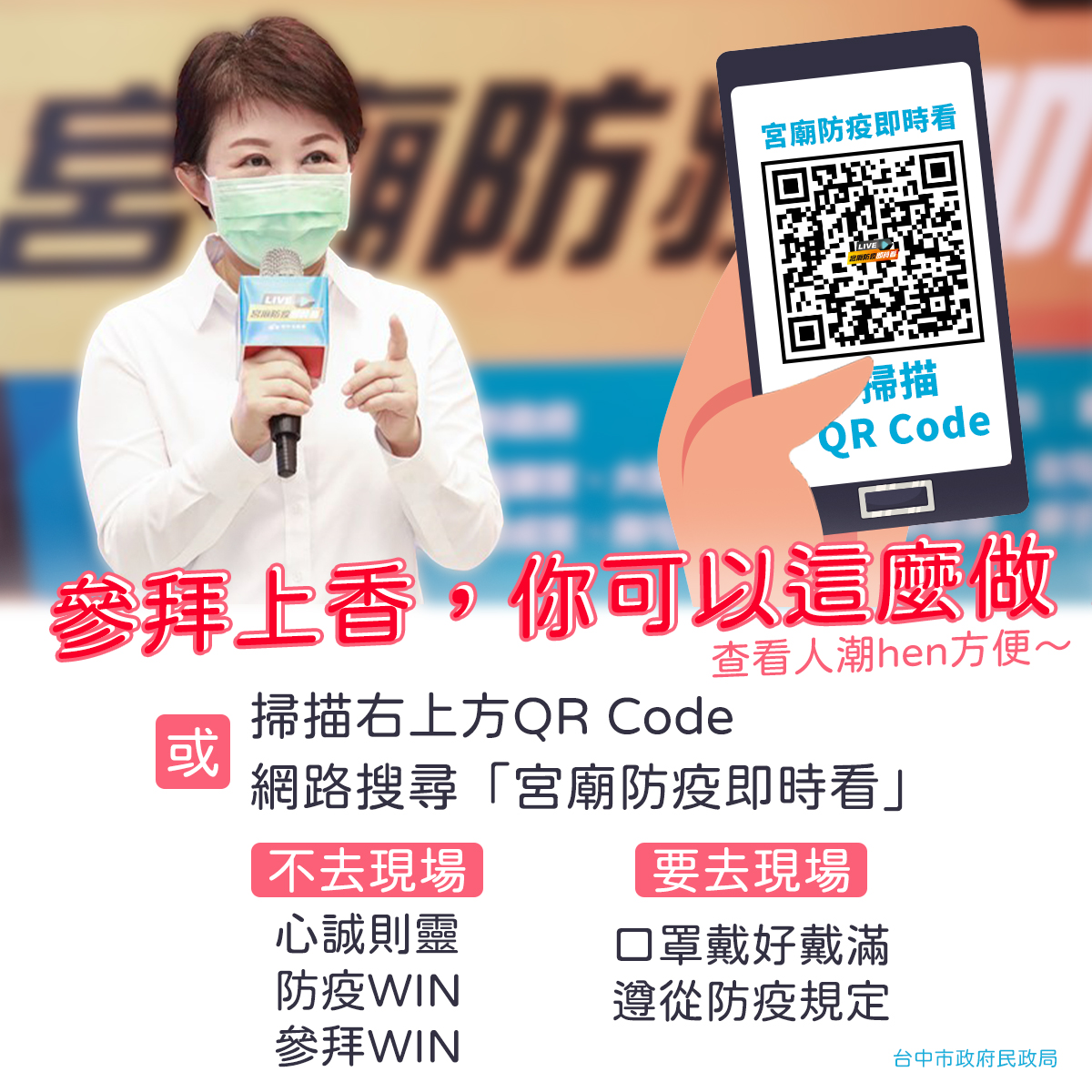 近日國內新冠肺炎疫情嚴峻,中央流行疫情指揮中心宣布進入二級警戒狀態,停辦室外500人以上,室內100人以上集會活動。為降低宮廟活動群聚感染風險,市長盧秀燕除在防疫會議上呼籲各宗教團體於防疫期間配合停辦各項活動,並請民眾多利用市府首創「宮廟防疫即時看」視訊服務,可立即觀看台中13處宗教場域現場即時影像,方便民眾避開人潮,兼顧民眾參拜誠意。