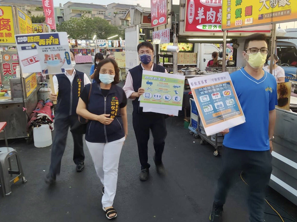 經發局表示,近日本土確診案例攀升且出現感染源不明的本土病例,市府以防疫為第一要務,昨日持續派員至夜市稽查各項防疫措施,太原觀光夜市及旱溪夜市皆已啟動容留人數管制,當人數超過管制量時將管制民眾進入,並在出入口有專人量測體溫及備有酒精供民眾消毒,民眾及攤商配合情況良好。