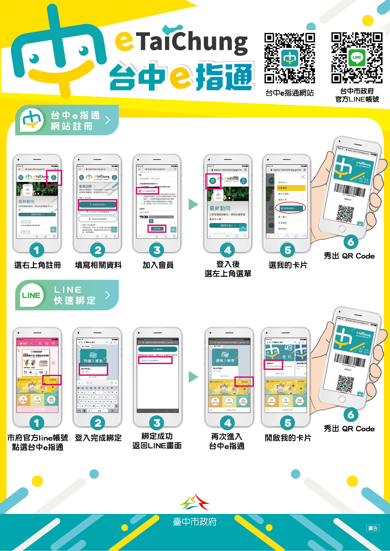 資訊中心表示,除原本「防疫追蹤溯源實名登記app」,或出示身分證條碼掃描外,明日起民眾可用台中e指通數位市民虛擬卡進行實聯登記,並從市府台灣大道市政大樓、文心第二市政大樓、陽明市政大樓及各市立圖書館首先開放使用,其他機關場館預計於61日加入。提醒民眾完成會員註冊申請後,可以在市府官方LINE帳號進行登入綁定,並將台中市政府官方LINE帳號釘選起來,出示我的卡片會更方便,歡迎民眾多加利用!詳情請上台中e指通官方網站 https://tcpass.taichung.gov.tw/ 查詢。