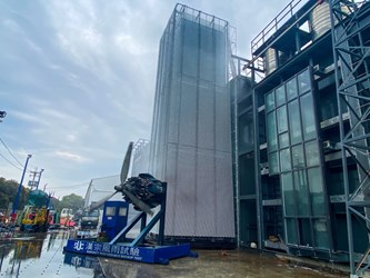 建設局說明,建築師在實驗艙建立高約18公尺的「1比1」美術館大廳轉角玻璃帷幕局部試體,進行一連串包含氣密性與水密性能測試,模擬風雨環境的強度。利用渦輪飛機引擎模擬出仿真颱風動態風壓,並施加壓力達設計風壓值1.5倍的嚴苛條件,經風雨測試通過後,將積極展開玻璃帷幕產製,推展工程後續進度。