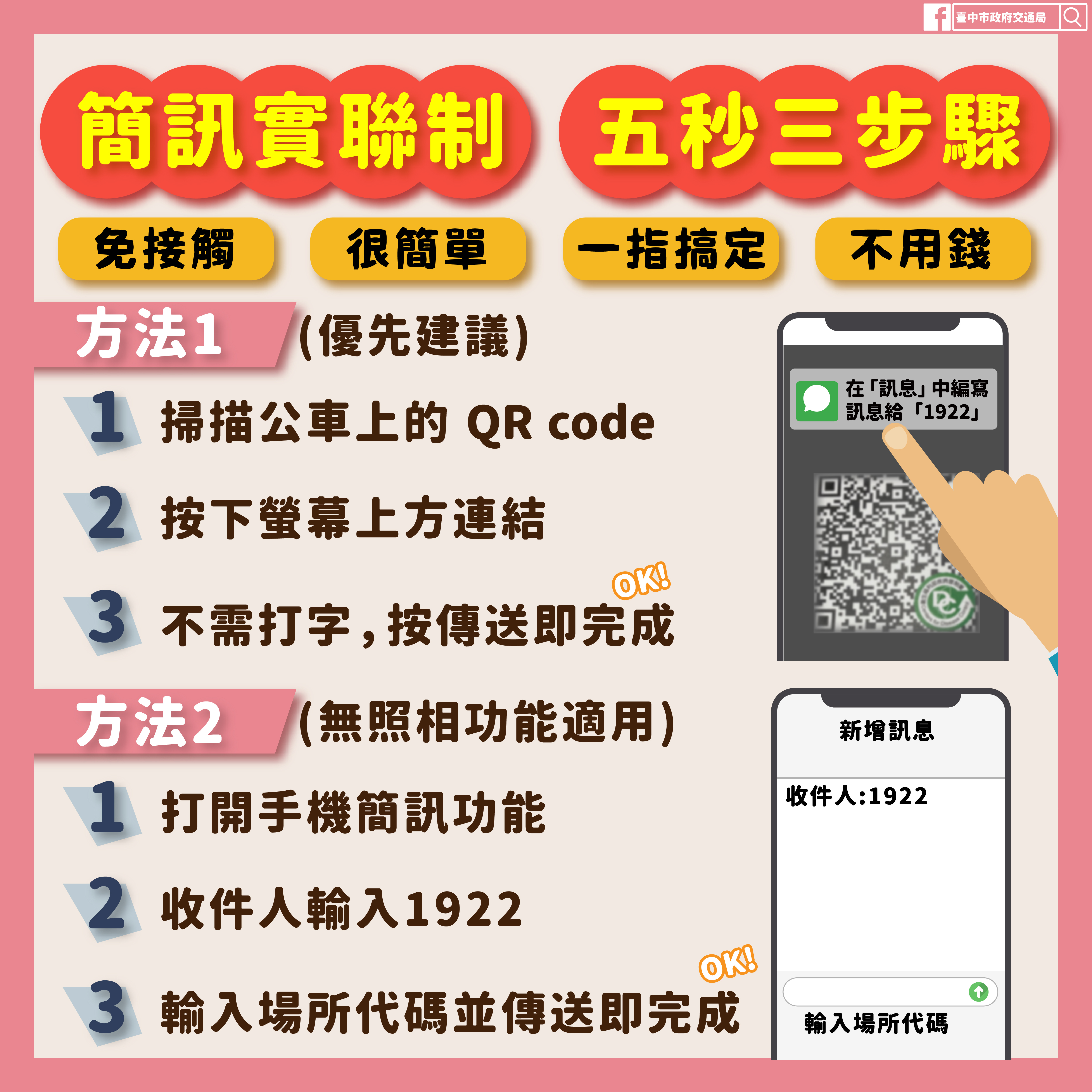 國內疫情升溫,為杜絕大眾運輸防疫破口,台中市政府交通局配合行政院研發簡訊實聯制,明(21)日起實施台中市公車實聯制,每輛公車車門皆會張貼QR Code及使用說明,供民眾掃描,掃描後按下連結,並在簡訊程式傳送自動跳出代碼到1922就完成實聯制;同時除了車輛自身消毒外,在全市公車車上全面提供酒精,供乘客消毒使用,更多一層保護,全力守護民眾健康。