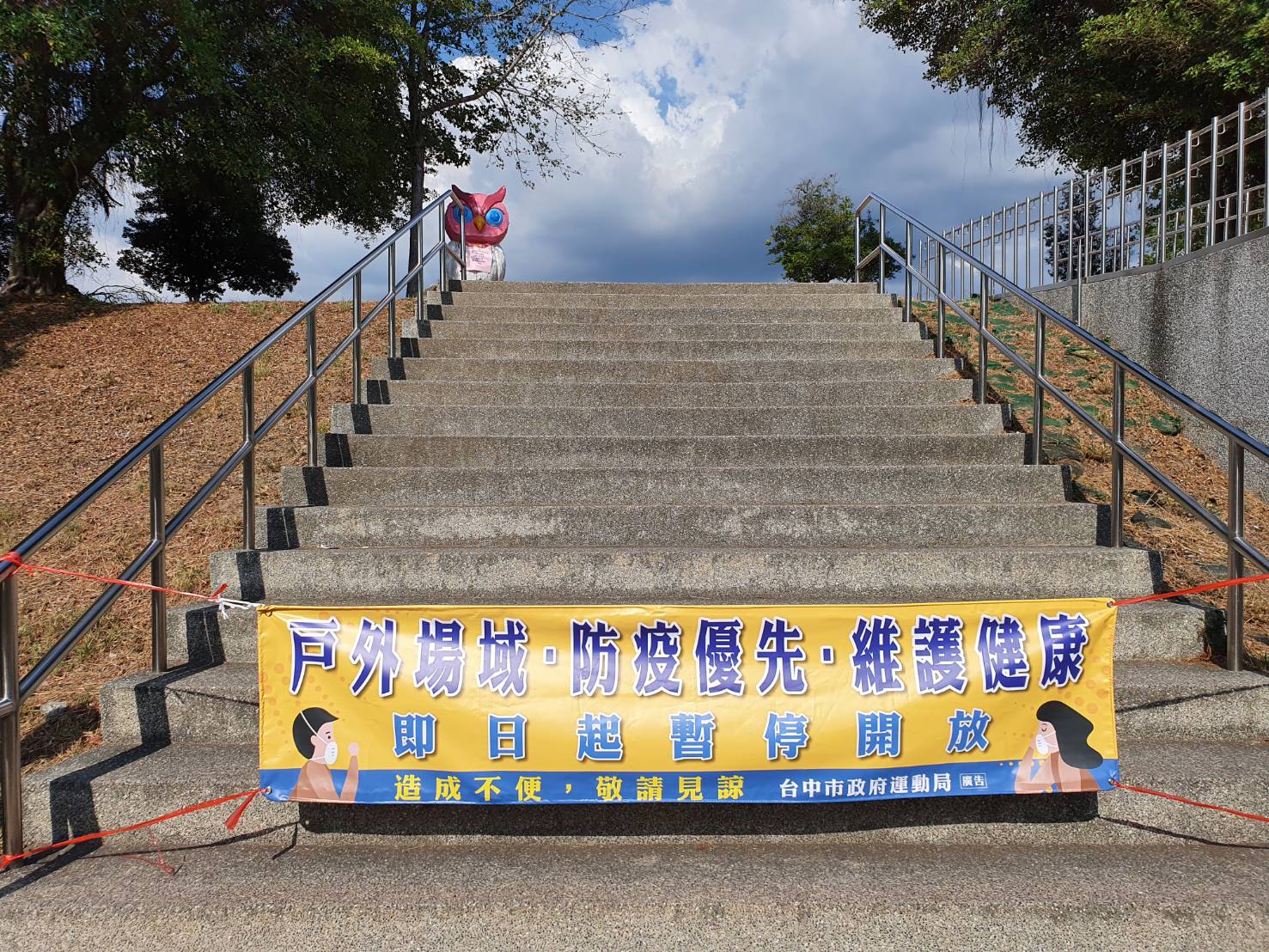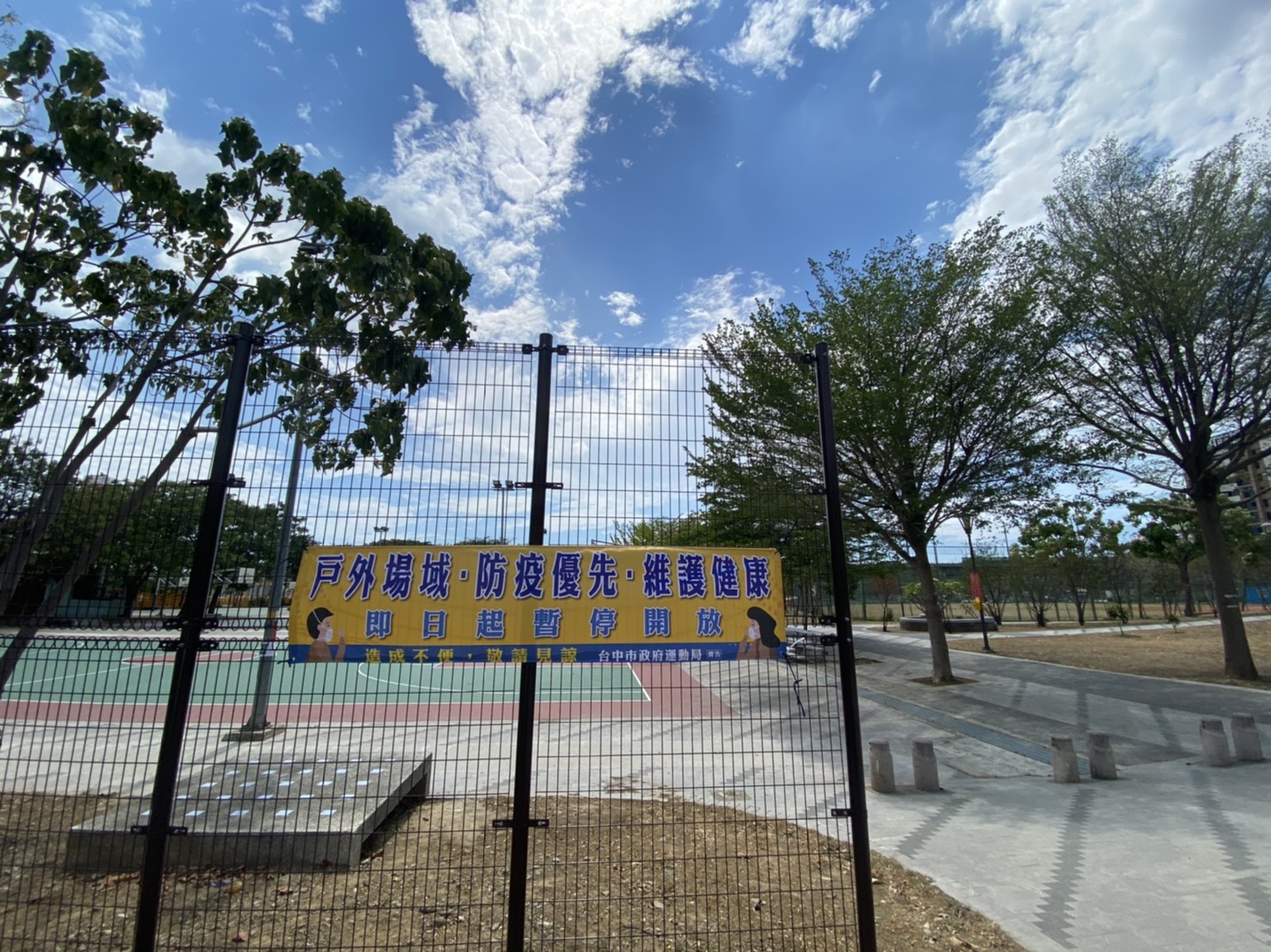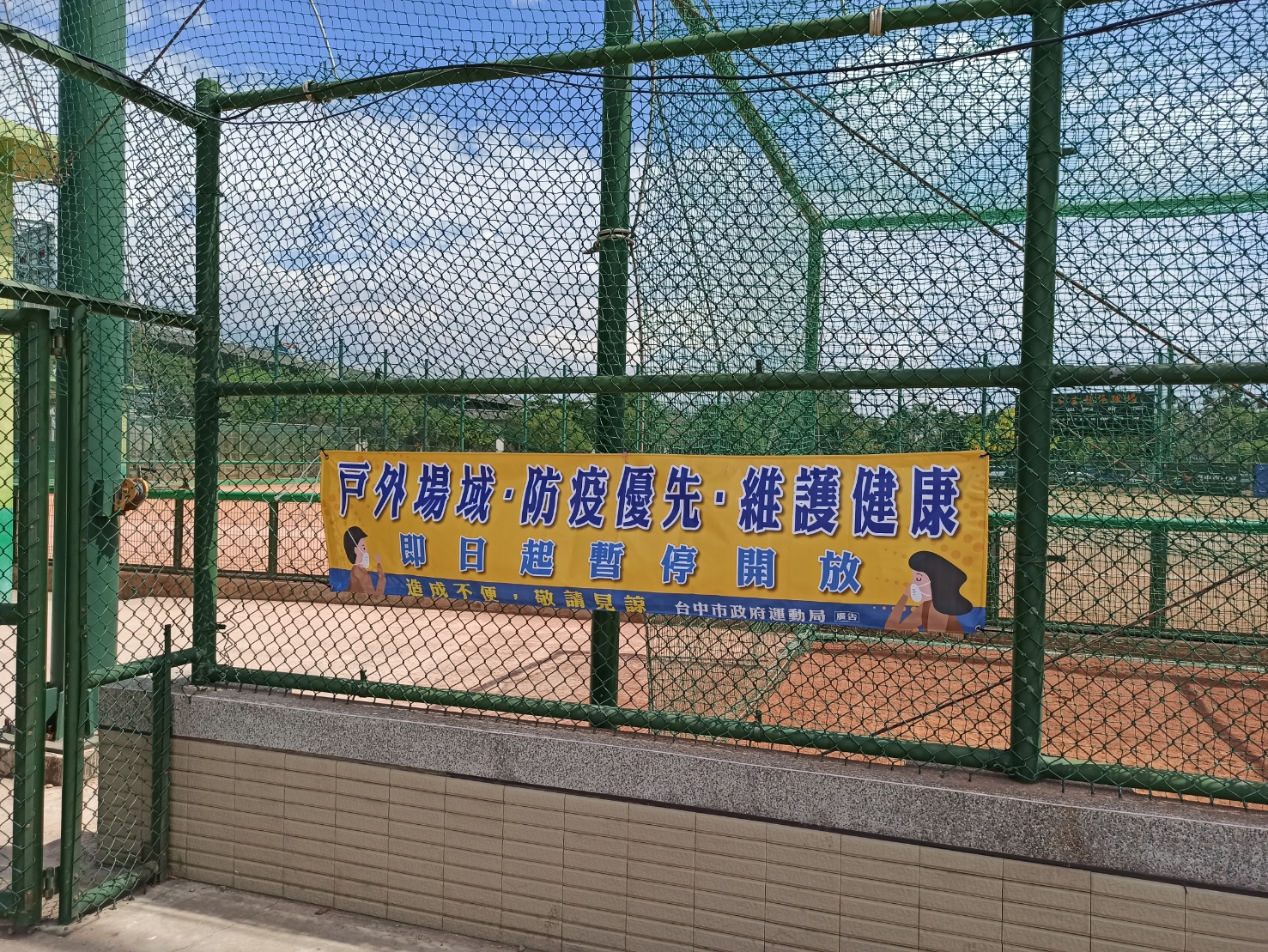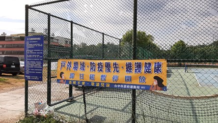 運動局表示,為預防疫情擴散,5月18日已公告台中市戶外運動場地,如籃球場、網球場、棒壘球場、槌球場、足球場、曲棍球、手球等球類運動場域及室外溜冰場、兒童遊具及體健設施等設施暫停使用,並持續加強消毒作業。
