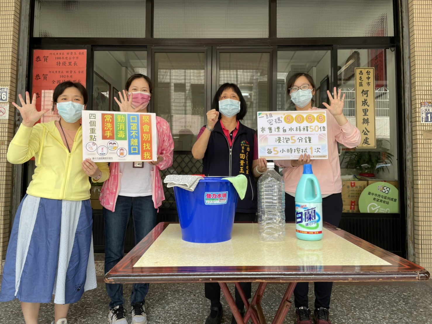 霧峰區萬峰里里長林麗真則呼籲防疫大家一起來,尤其是門把、鞋櫃、茶几、餐桌、座椅是手或身體最常碰觸的地方,利用「5055消毒法」自製簡易消毒水定時擦拭這些物品表面,就可以達到很好的消毒效果,安全又有效。
