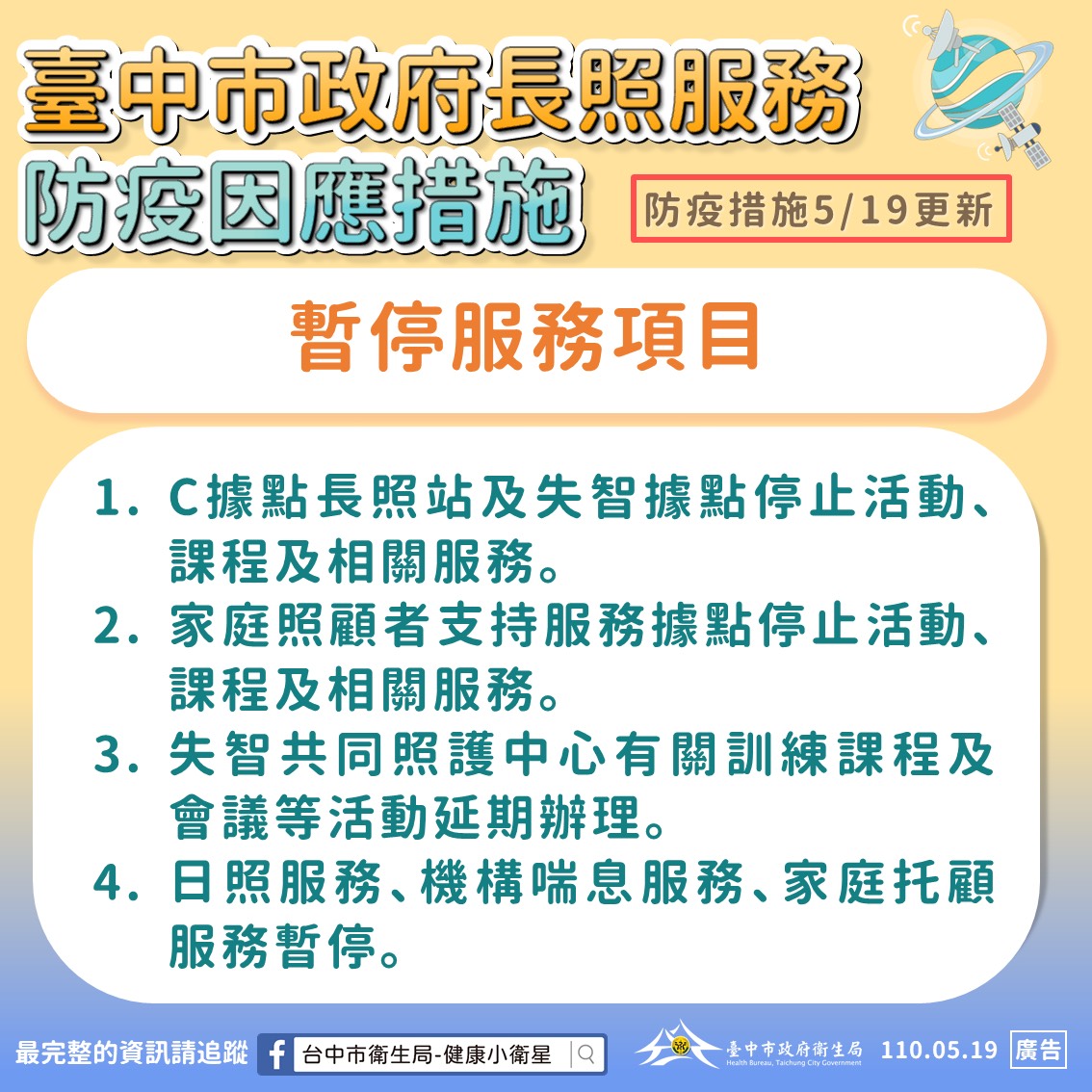 另因應全國三級警戒延長至614日,為加強防疫,台中市部分長期照顧服務持續暫停服務包括C據點長照站、失智社區服務據點、家庭照顧者支持服務據點、日照服務、機構喘息服務、家庭托顧服務等社區式服務,另交通接送、居家喘息、送餐、輔具、護理之家、居家失能個案家庭醫師照護等服務則持續提供,若民眾有長期照顧服務相關疑問,可撥打1966專線洽詢,將有專人服務。