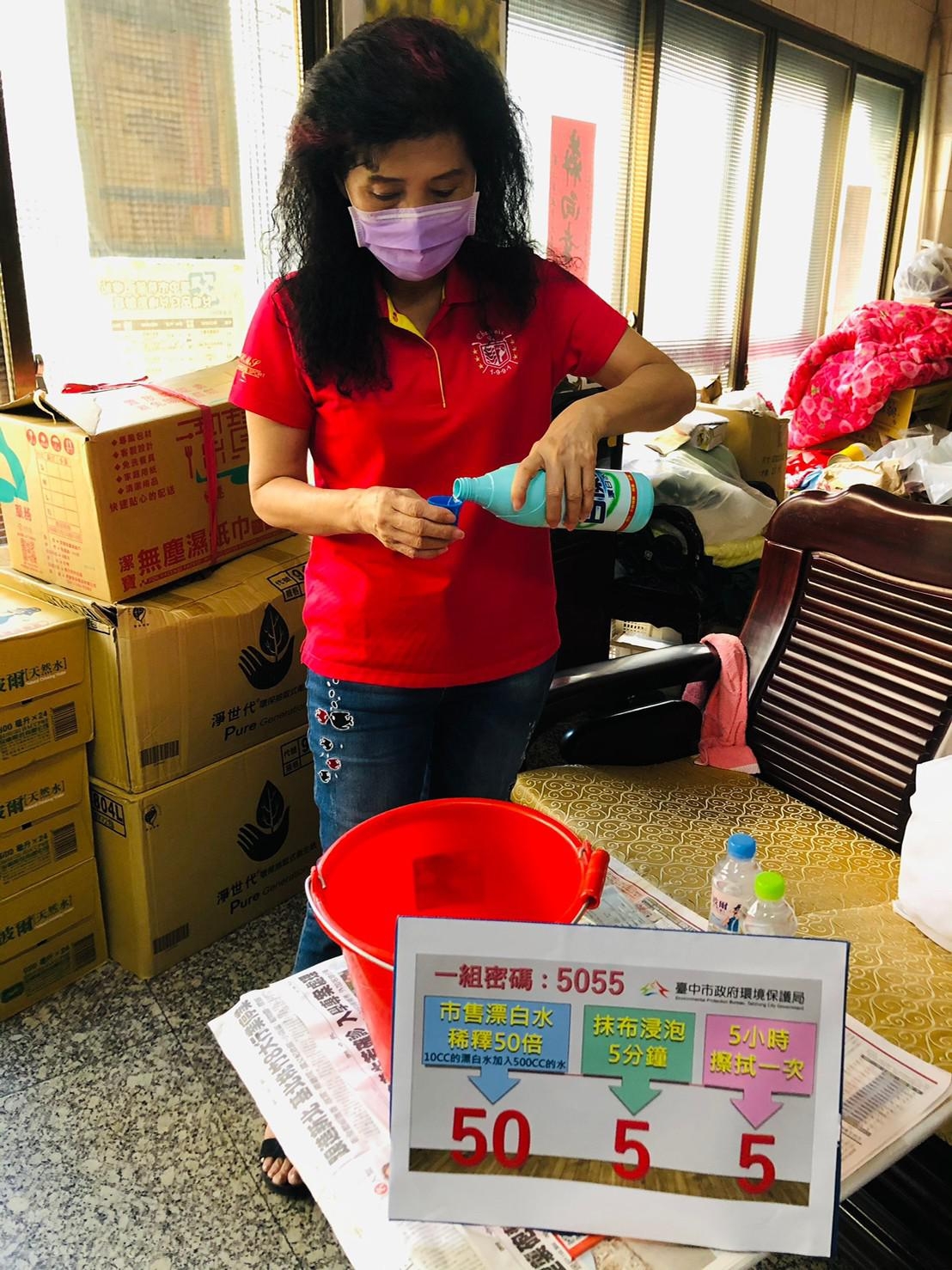 環保局長陳宏益表示,「5055」這組密碼是製作消毒水的口訣,買一般市售的漂白水,用10c.c.的漂白水加入500c.c.的清水,即可稀釋50倍的漂白水,把抹布浸泡5分鐘,每5個小時擦拭一次,包括桌、椅、門把與手機等,且手部最常碰到的地方,用浸過漂白水的抹布擦乾,效果最好。