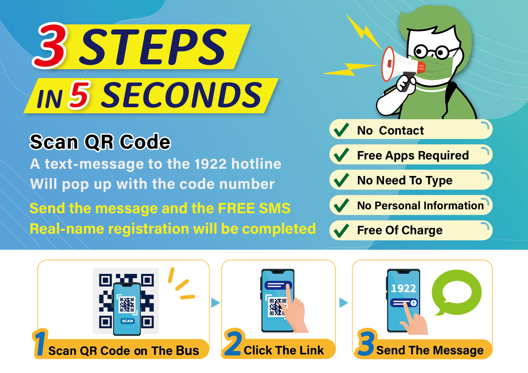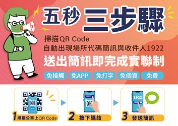 交通局指出,公車簡訊實聯制步驟簡單快速,僅須掃描公車上的QR-CODE,並依指示將簡訊送出,很快就可以完成公車簡訊實聯制。簡訊實聯制擁有「免個資、免APP、免打字、免接觸、免收費」五大優勢,資料蒐集僅供疫調使用,超過28天將自動刪除,民眾無須擔心隱私問題。另外,若無照相功能的手機,僅須開啟簡訊功能,訊息欄位輸入該部公車對應的場所代碼後發送至收件人1922,也可輕鬆完成簡訊實聯制。