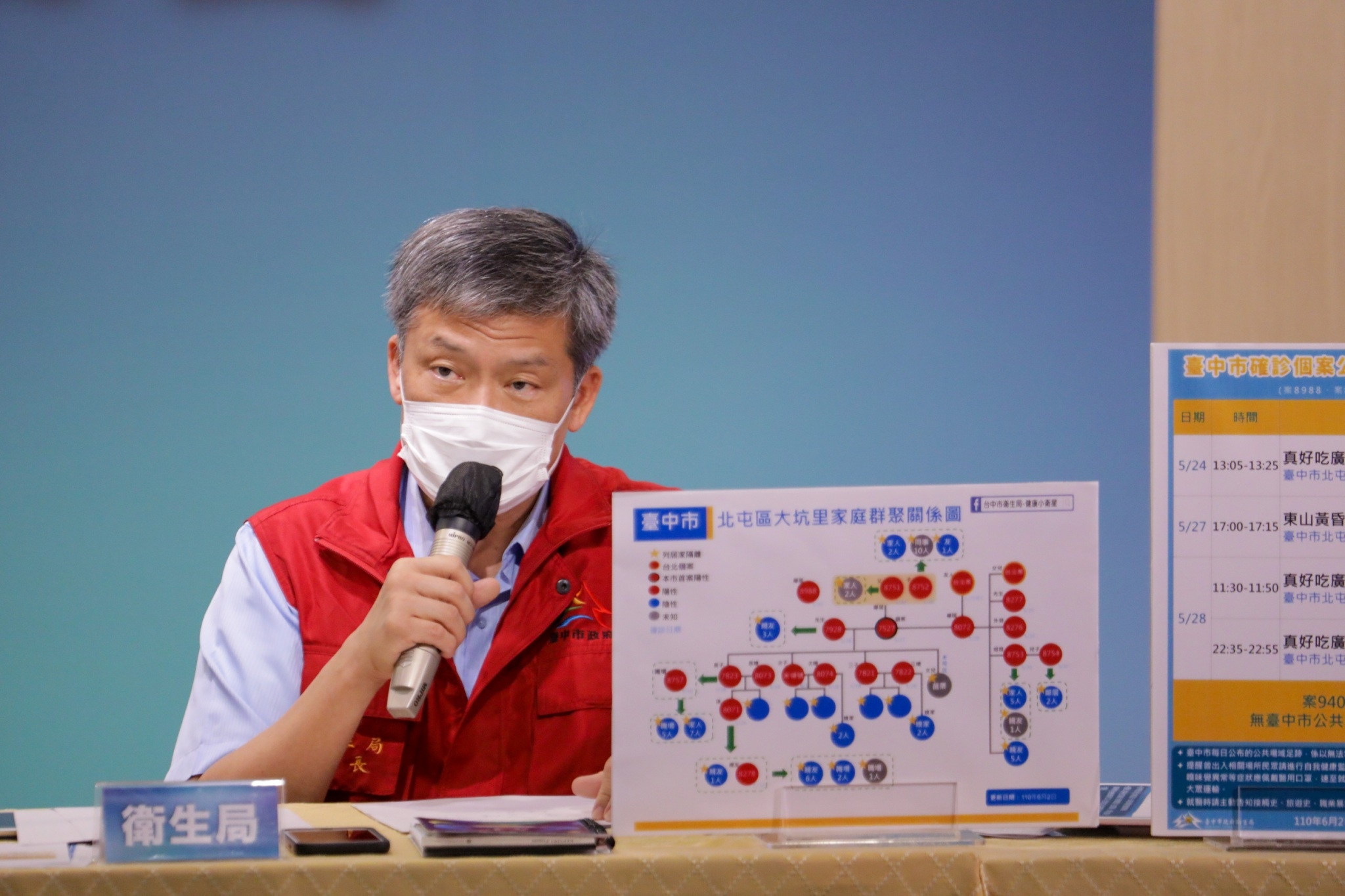 衛生局長曾梓展針對今日本土確診個案及公共場所足跡一一說明,北屯家庭群聚案今日新增1例確診,至今台中市確診18例及1例尚未編號,加上台北市確診2例,已累計21例。案8988北屯區63歲男性,職業為筍農,近期無旅遊史、也無新冠肺炎相關症狀,5月27日曾至東山黃昏市場,30日至大坑國小快篩站檢測陰性,因屬高風險對象,再經PCR檢驗確診。