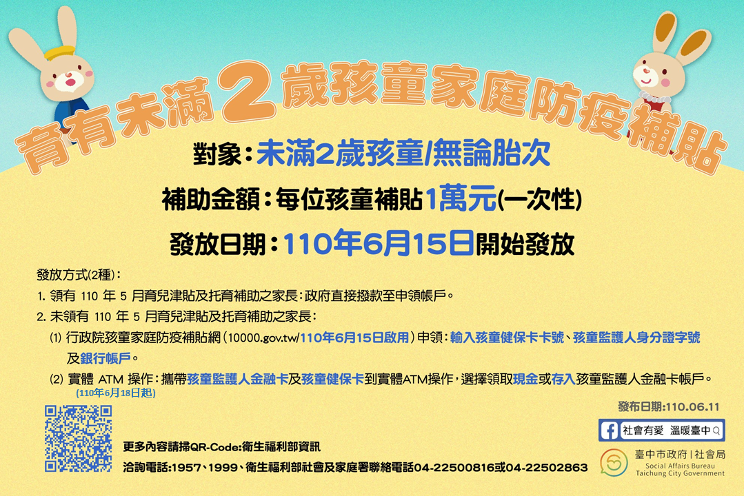 社會局說明,家中幼兒若於三級疫情警戒解除前出生,並完成出生或初設戶籍登記,家長可領取一次性補貼1萬元。若家長領有今年5月育兒津貼及托育補助,政府直接撥款至申領帳戶;如未領有今年5月育兒津貼及托育補助,可持孩童監護人金融卡,透過專屬網站或ATM領取現金1萬元。