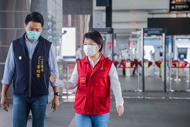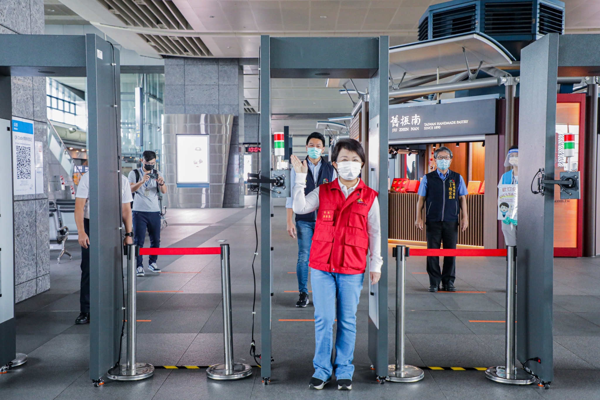 因應端午3天連假,台中市政府在台鐵、高鐵等重要交通場站設置「消毒防疫門」,旅客經過「消毒防疫門」可同時量測體溫與消毒全身。市長盧秀燕繼日前至台中火車站視察,今(12)日再至高鐵台中站視察「消毒防疫門」運作情形,她表示,今日高鐵站人潮少有比較放心,市府連假期間派出景點疏導隊於人潮熱區加強宣導勿群聚,希望大家期間少外出,度過平安、健康的假期。