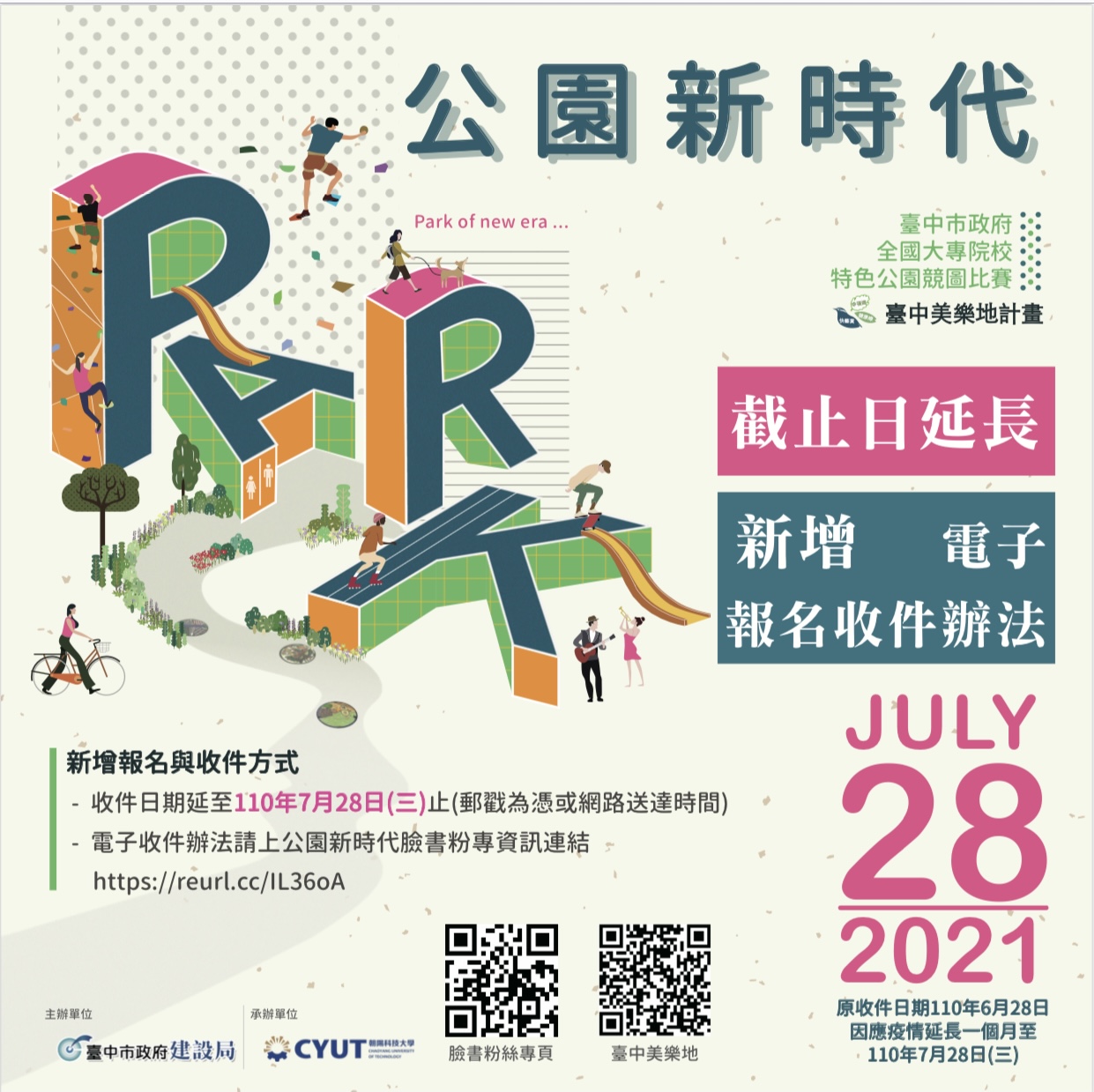 台中市政府建設局第2屆全國大專院校特色公園競圖比賽「公園新時代」原定628日截止收件,考量新冠肺炎疫情嚴峻、全國疫情三級警戒,為避免同學於基地調查或印製作品時衍生染疫隱憂,建設局將徵件時間由原定628日延長一個月,改為728日截止,並新增「電子收件」方式,盼藉此讓參與者擁有充足時間思考作品完整性,同時降低染疫風險。