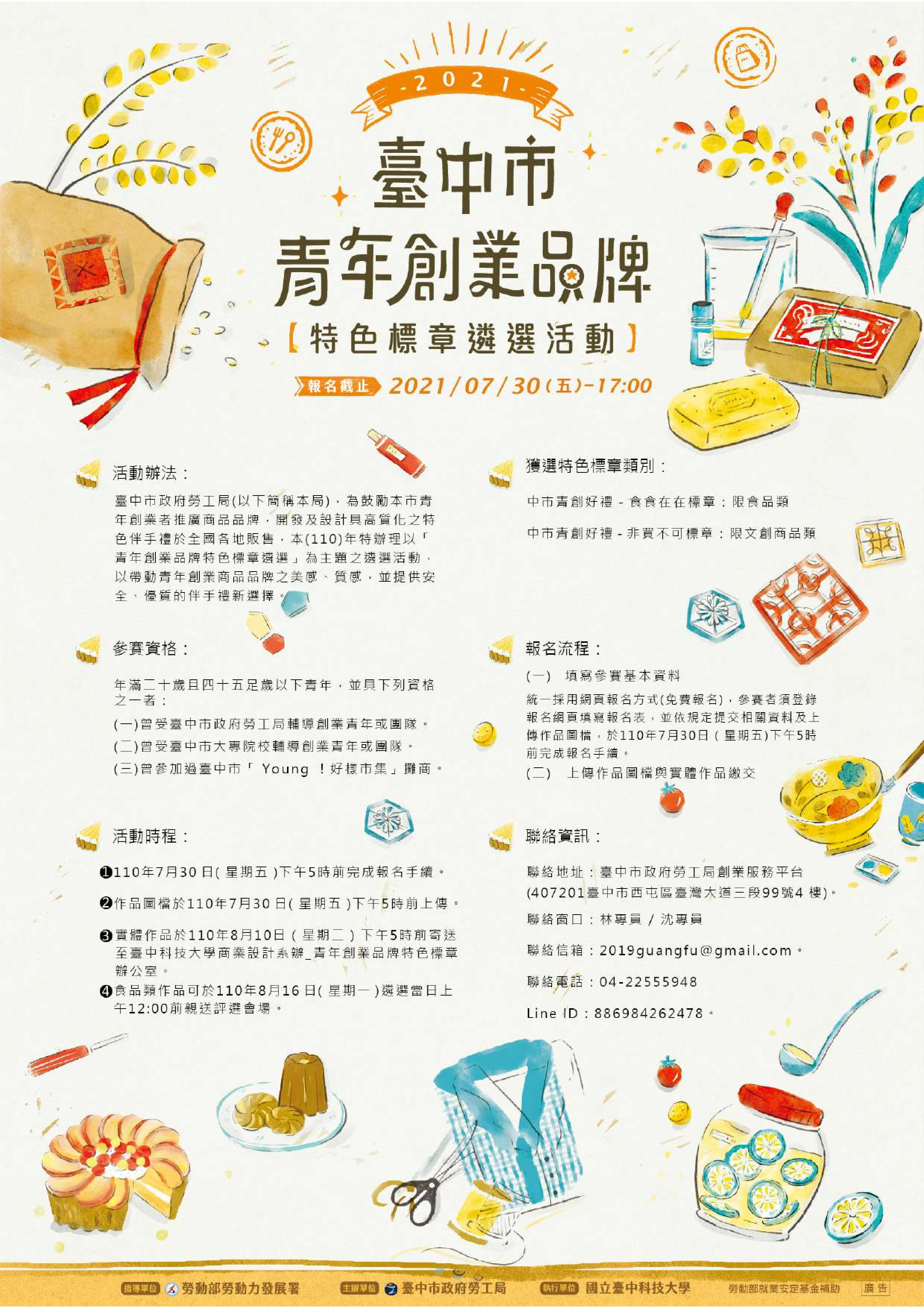 勞工局長張大春表示,「2021台中市青年創業品牌特色標章遴選」徵件開跑,歡迎年滿20歲且45足歲以下青年,且符合目前及曾進駐台中青創基地(光復新村、審計新村、摘星山莊)的創業青年、台中市大專院校所推薦受輔導創業青年或團隊、曾參加過台中「Young!好樣市集」攤友資格之一者報名參賽。今年評選分為「在地特色美食」與「文創商品」兩大類,將遴選出10名「中市青創好禮-食食在在標章」及10名「中市青創好禮-非買不可標章」。