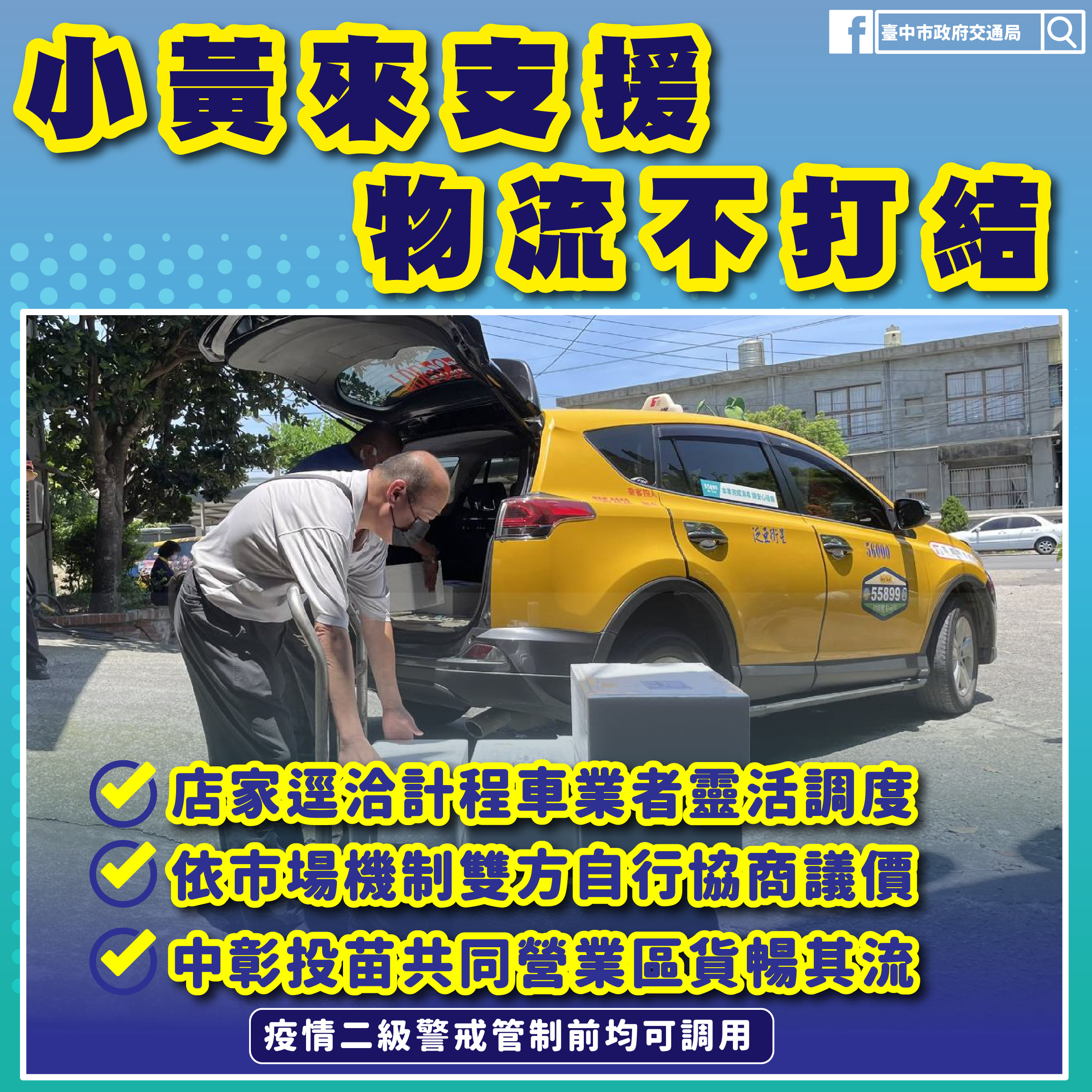 國內疫情爆發,改變民眾消費行為,從出門購物改為透過線上或網路採買民生物資宅配到府,使物流需求大增,台中市政府交通局為讓各類貨品、餐點迅速如質如期送達民眾手中,自即日起與市內計程車客運業者合作推出「協助載送貨物及外送餐點」服務,歡迎各計程車業者一同加入行列,全民攜手共度疫情難關。
